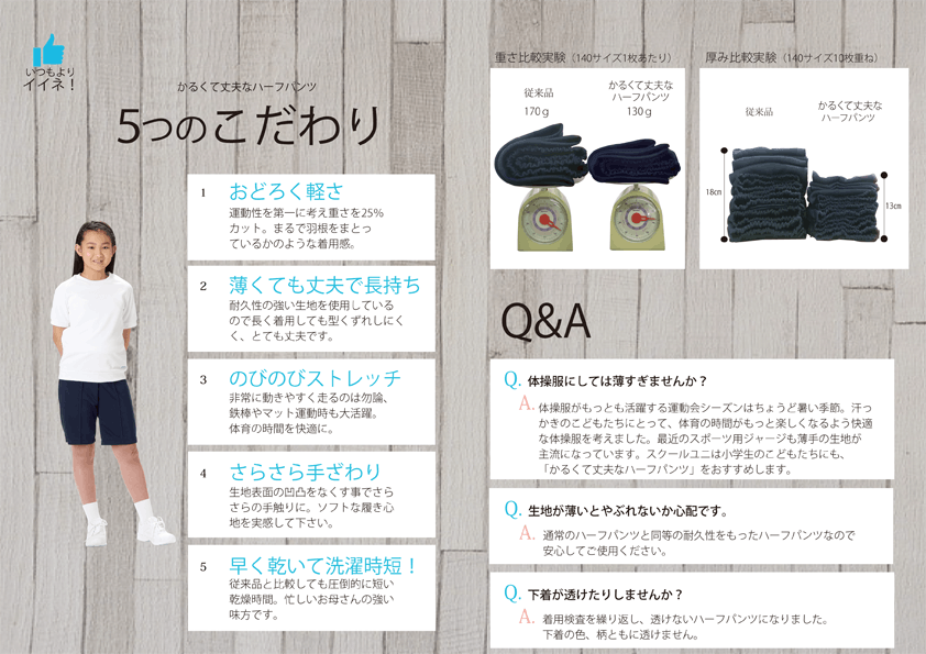 東京・大阪・名古屋の各地で小学生のお母さん方に体操服についてのお悩みや要望等を伺い汚れが落ちやすい体操服など意見を具現化してきました。