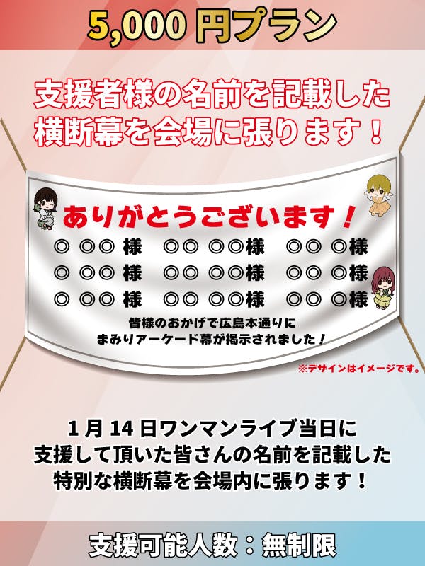 A:All-or-Nothing方式を採用しておりますので目標金額に満たない場合は、広告の掲示/会場内横断幕の掲示はございません 。