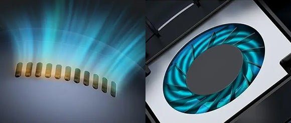 発受信機の上部は中空彫刻デザインが採用されたほか、ファンが内蔵されているので空気が流れやすく冷却性に優れています。