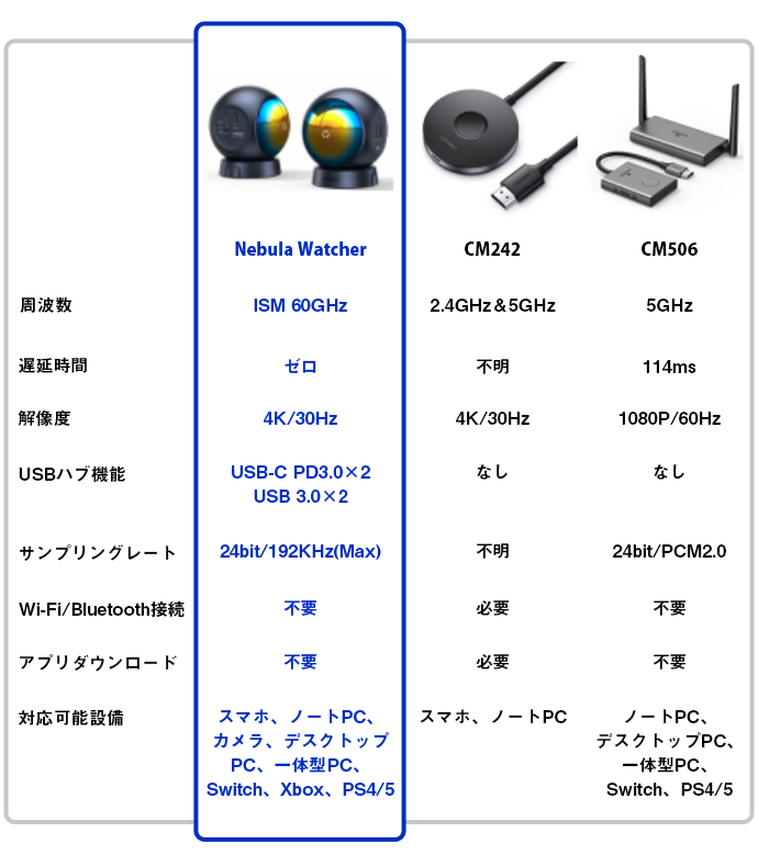 「Nebula Watcher」は最先端の5Gミリ波技術を搭載し、60GHzミリ波の高周波数帯でゼロ遅延を実現しました。また、一般的なワイヤレスイヤホン、スマホ、Wi-Fiなどのデバイスが利用している0~5GHzの周波数帯と違い、干渉されず安定性も優れています。