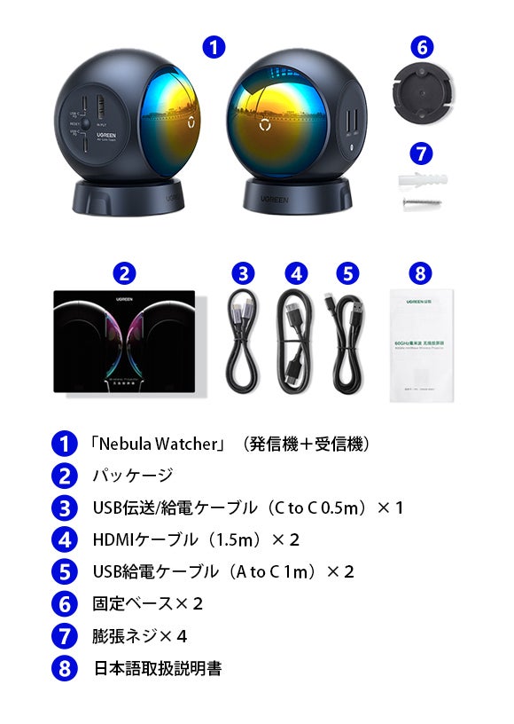 また、ベースを2つと膨張ネジが4つ付属されています。こちらは「Nebula Watcher」を壁や卓上に固定する際にご利用いただけます。