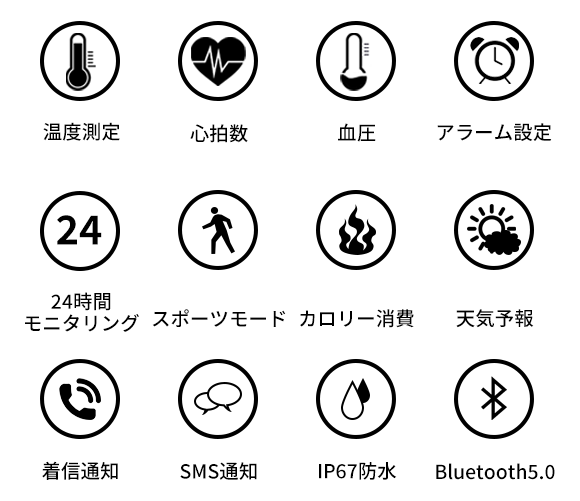 A.一定間隔で自動測定出来るのは「体温・心拍数」のみです。ほかの健康管理機能は自動で測定は出来ませんが、アイコンをタッチしてすぐに測定することが可能です。