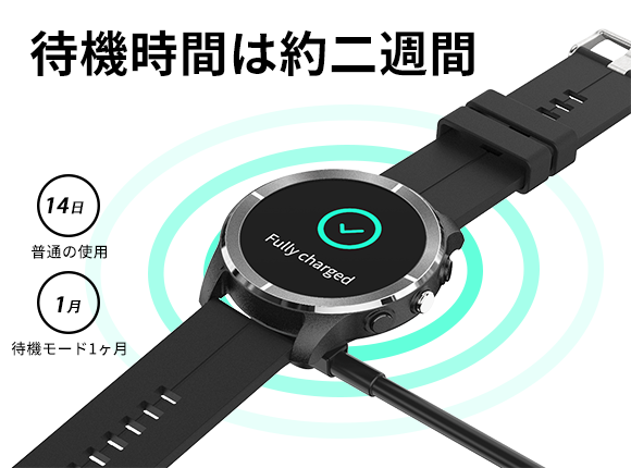 250mAhバッテリー搭載。付属の磁気吸着式充電ケーブルを使って2時間充電すれば約二週間ほど使用可能!時間を見るだけなら、一ヶ月間待機可能です!