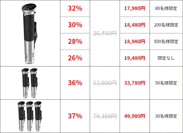 2022/10/17 10:29ページをご覧いただいている皆様、こんにちは!本日、プロジェクトを公開させて頂きました。プロジェクトページをご覧いただき、誠にありがとうございます。「LOVISIDA(ロービーシダー)」の特徴・低温調理技術を採用し、食材のうまさを保ちながら自宅でもプロレベル調理・0.5℃単位でよりこまかく設定できるほったらかし調理・1200Wハイパワーで設定温度到達までの時間を短縮・IPX7防水仕様で丸洗いする事も可能・310*83*50.8mmでわずか1.1kg!軽くて持ち運びに便利商品についてご質問、ご不明な点がございましたら、お気軽にご連絡ください。目標達成に向けて頑張りますので、どうぞよろしくお願いいたします! もっと見る