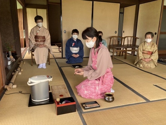 私の家にも茶器が活躍されず保管されています。今回、広島県さとやま元気プロジェクト支援で古民家を半年借りました。ワークショップ会場に、茶器を飾り、時として、写真のような野立てに茶器が輝きました。