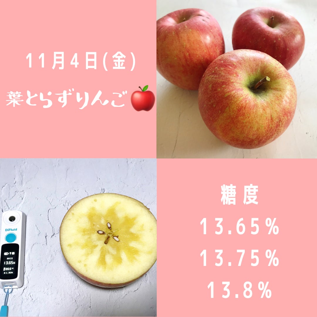 11月4日(金)に葉とらずりんごの様子を見に行って来ました。あれ?1日に来た時は、りんごの葉が青々としていたのに、この3日程で黄色く紅葉した葉がちらほら。最近の寒さで一気に葉が紅葉したようです。今回も葉とらずりんごを3つ持って来て、今回は色つきが良くない物も糖度を測定してみました。糖度は14度に達していませんでしたが、色が良くない物も13.5度は超えていました。何といっても蜜がたっぷり入って来ました〜!!食べてみると味は濃く、とっても甘く感じます。次回様子を見に行くのが楽しみです!!