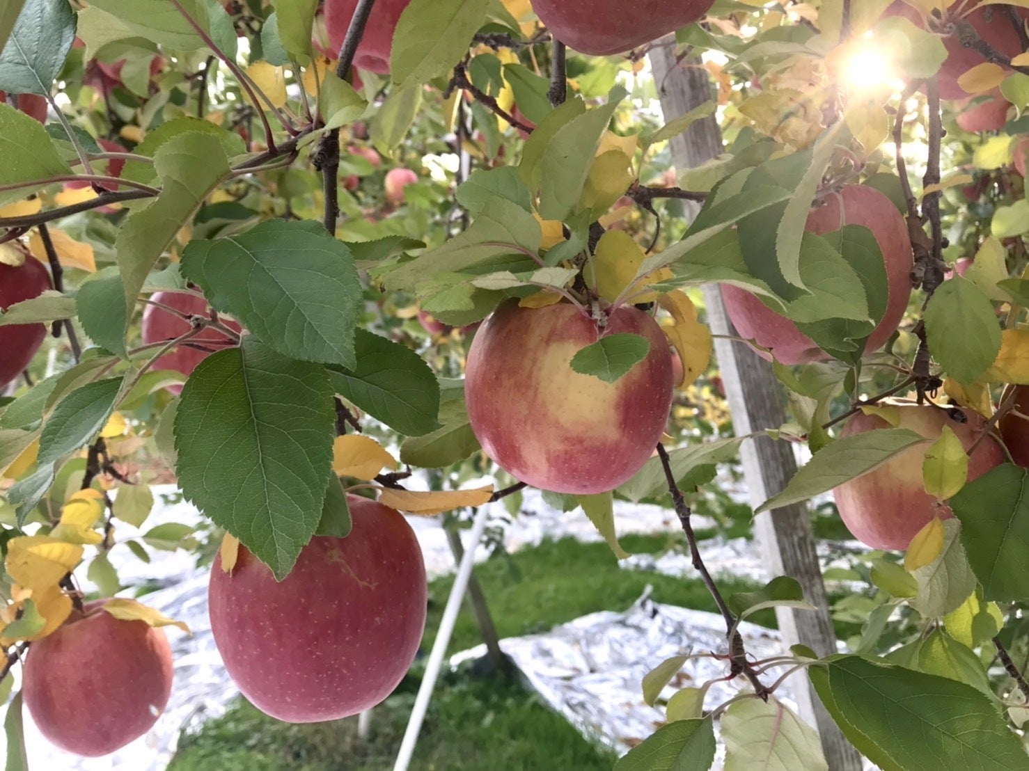 一般的に「葉とらずりんご」はツル回しもしないようですが、くすみファームではなるべく赤く色つけるためにツル回しをして、全体的に太陽を当ててみたのです。
