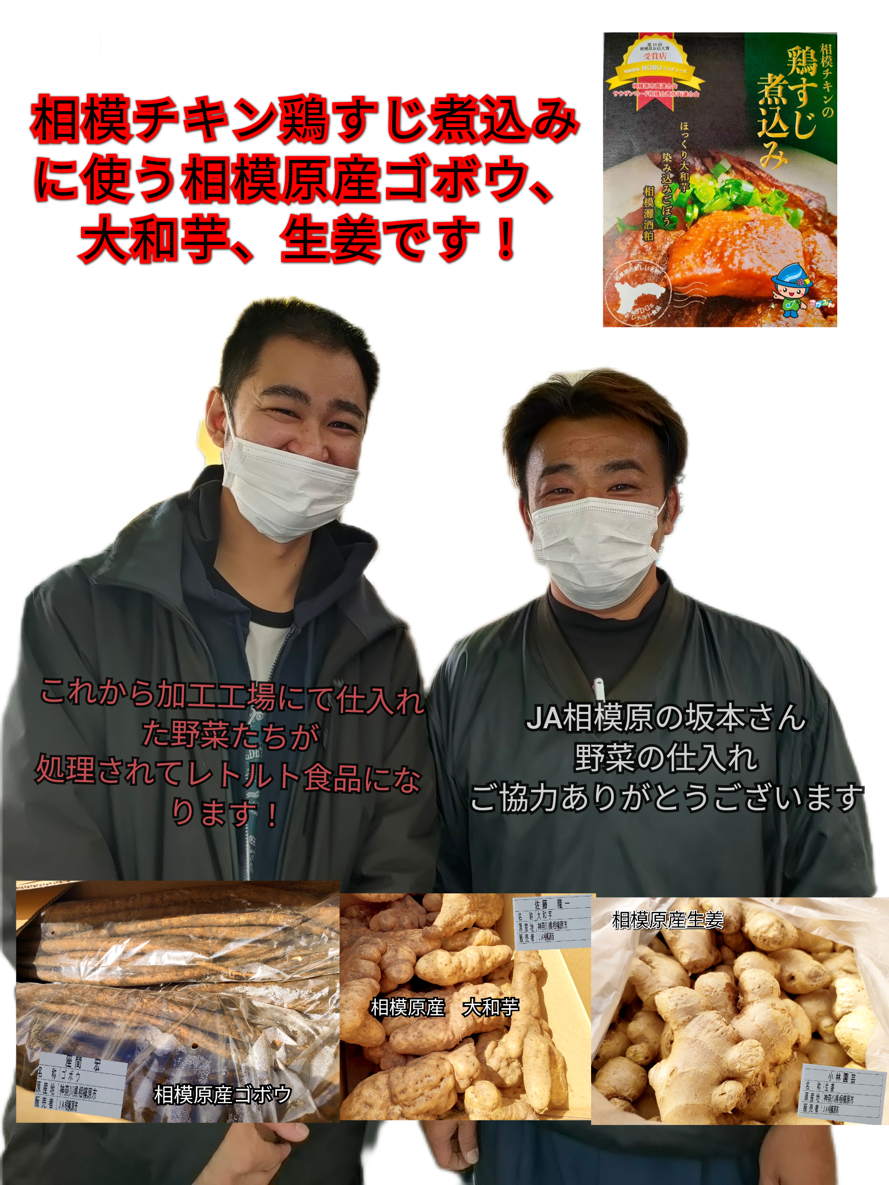 2022/11/14 13:00旬鮮酒場NOBUの店長のぶです!いつも応援ありがとうございますm(_ _)m 相模チキンプロジェクト〆切まであと4日となりました!引き続き宜しくお願いいたします!拡散宜しくお願いいたします!先日 JA相模原のご協力により相模チキン鶏すじ煮込みに使う相模原産野菜仕入れてきました!JA相模原の坂本さんいろいろご協力ありがとうございました。#相模原産 野菜です!麻溝ゴボウ大和芋生姜地元の野菜たち大量の野菜運搬作業ありがとうございました!感謝いたします!加工工場へと運ばれて レトルト食品に加工処理されます!完成、出来上がりが楽しみです!皆様もう少し待っててくださいね!それでは引き続き宜しくお願いいたします! 次回は相模女子大学の学生さんにデザインしてもらったパッケージデザインの鶏すじ煮込みの箱を制作します!印刷工場に潜入して 実際に仕上がりをチェックします! もっと見る