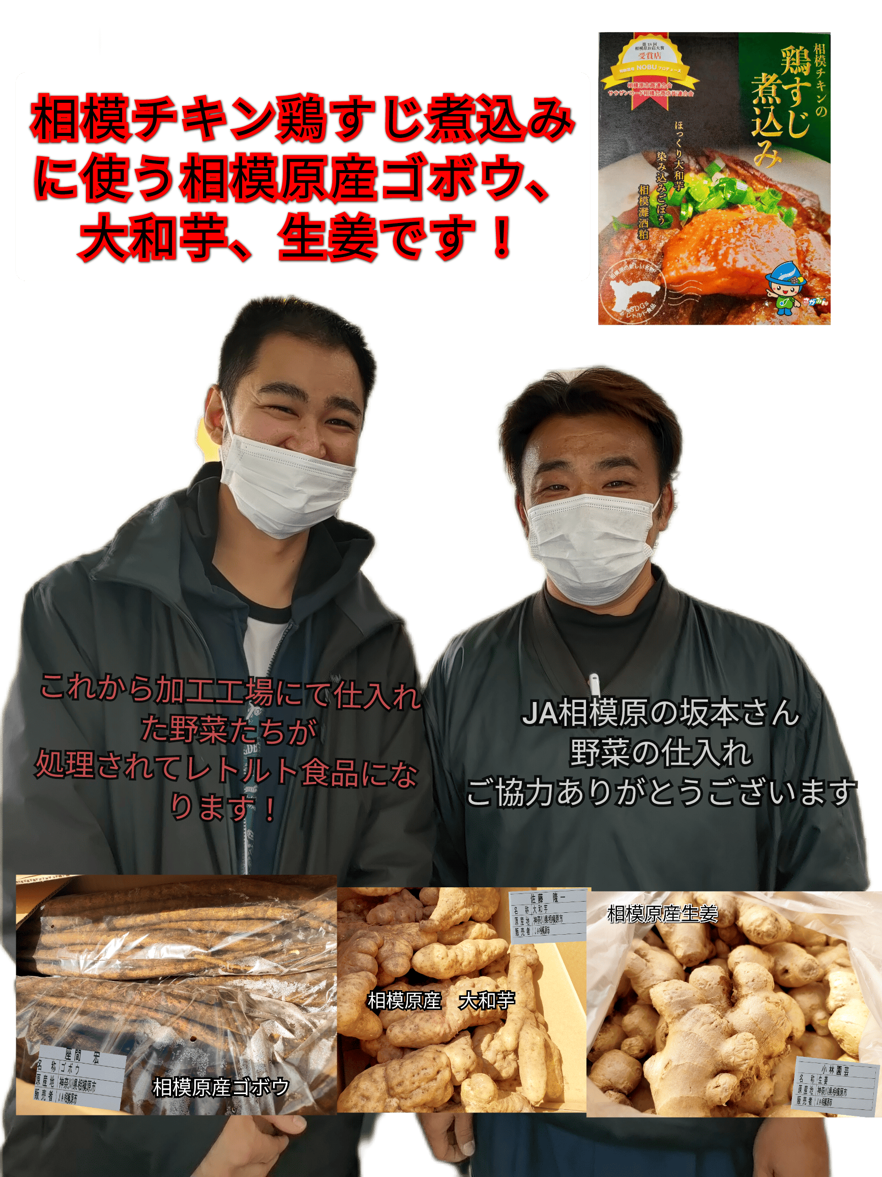 2022/11/14 13:00旬鮮酒場NOBUの店長のぶです!いつも応援ありがとうございますm(_ _)m 相模チキンプロジェクト〆切まであと4日となりました!引き続き宜しくお願いいたします!拡散宜しくお願いいたします!先日 JA相模原のご協力により相模チキン鶏すじ煮込みに使う相模原産野菜仕入れてきました!JA相模原の坂本さんいろいろご協力ありがとうございました。#相模原産 野菜です!麻溝ゴボウ大和芋生姜地元の野菜たち大量の野菜運搬作業ありがとうございました!感謝いたします!加工工場へと運ばれて レトルト食品に加工処理されます!完成、出来上がりが楽しみです!皆様もう少し待っててくださいね!それでは引き続き宜しくお願いいたします! 次回は相模女子大学の学生さんにデザインしてもらったパッケージデザインの鶏すじ煮込みの箱を制作します!印刷工場に潜入して 実際に仕上がりをチェックします! もっと見る