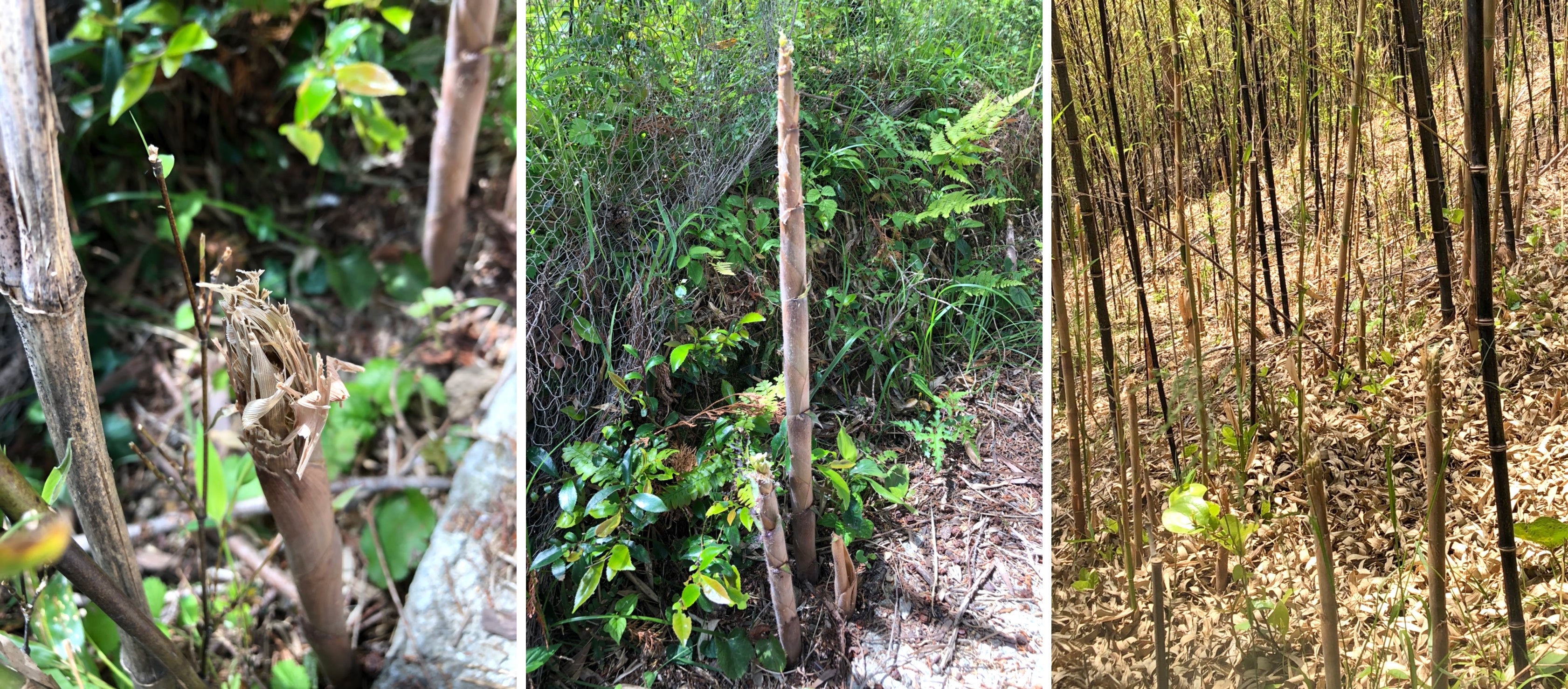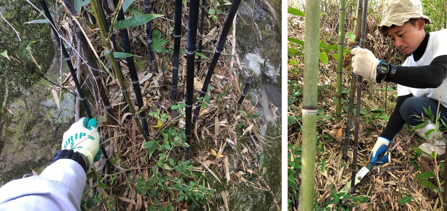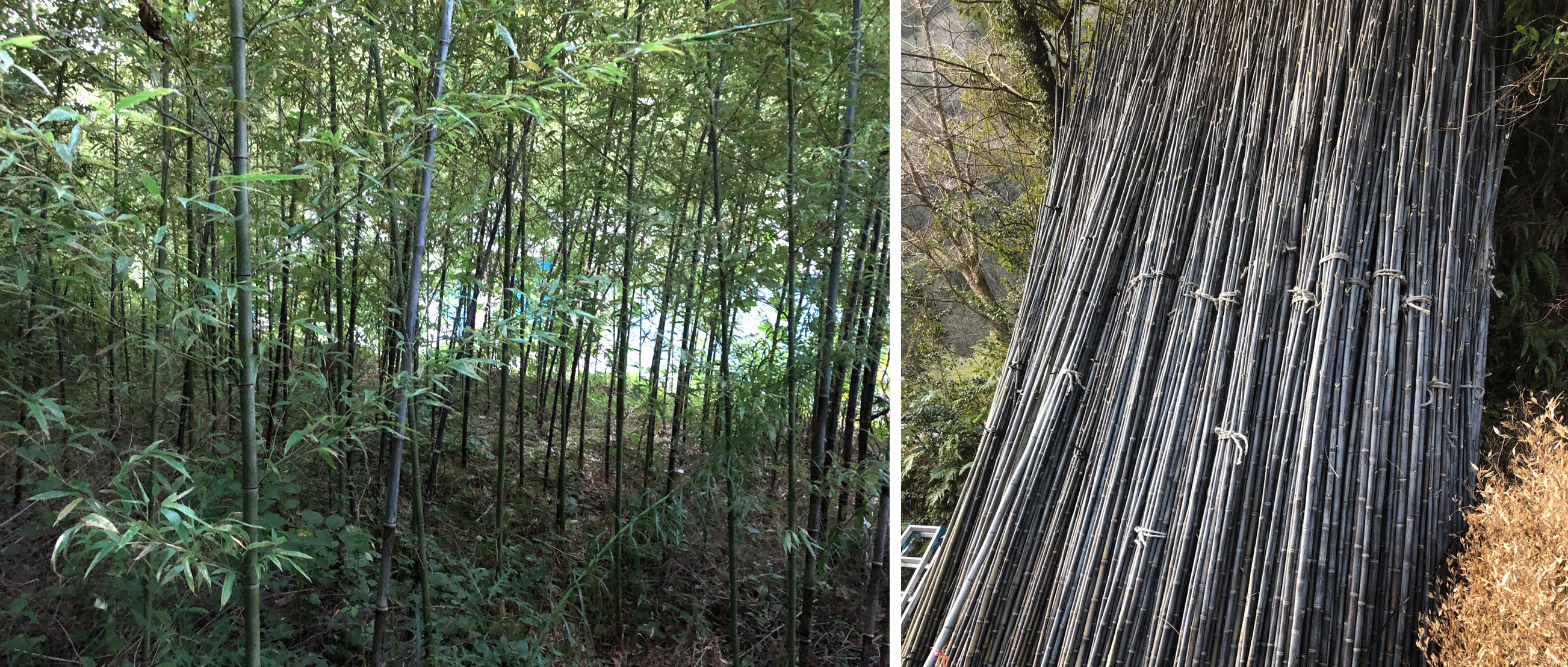 【山に群生している黒竹(写真:左) 伐(き)ってきた所(写真:右)】