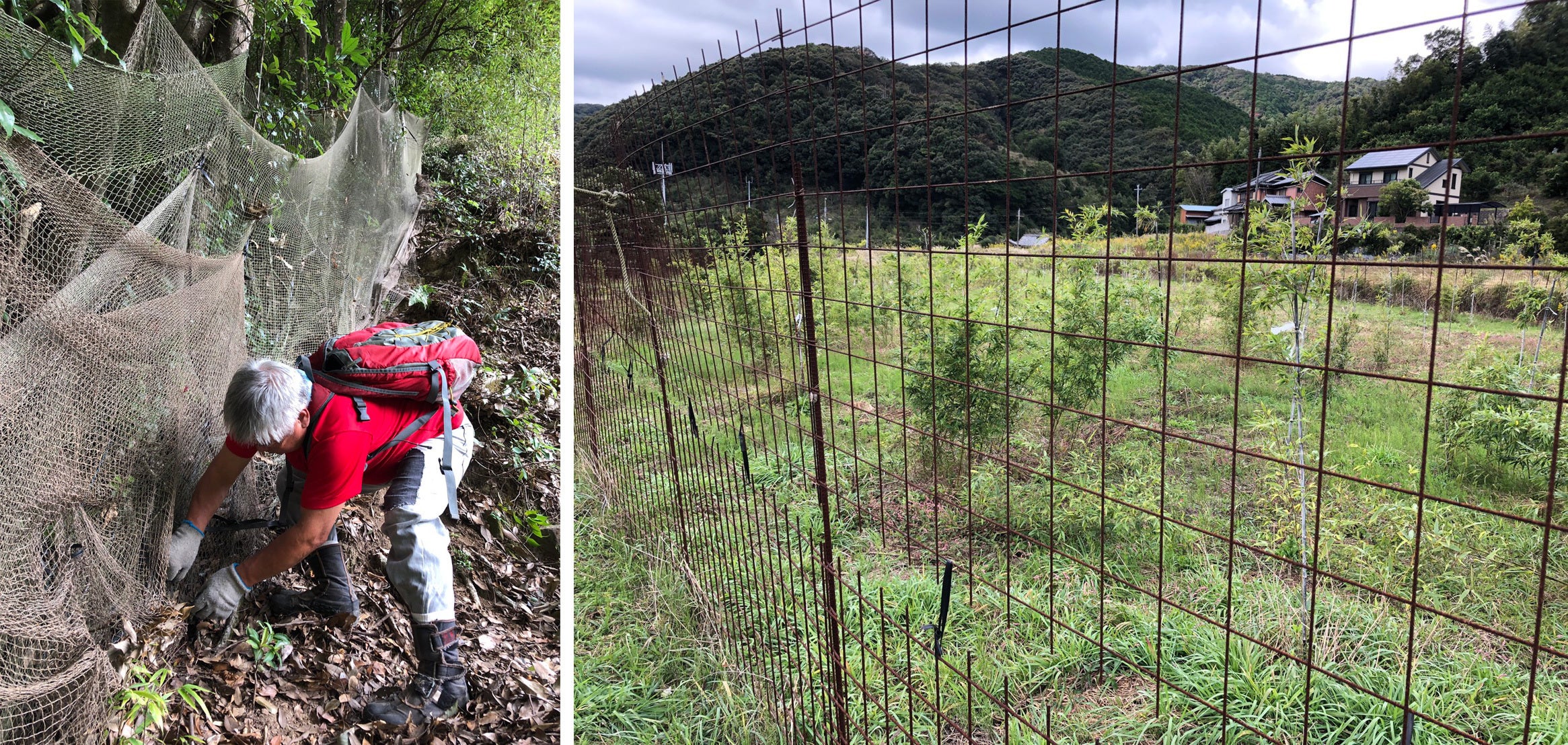 【網で囲い鹿が入ってこないように対策(写真:左)