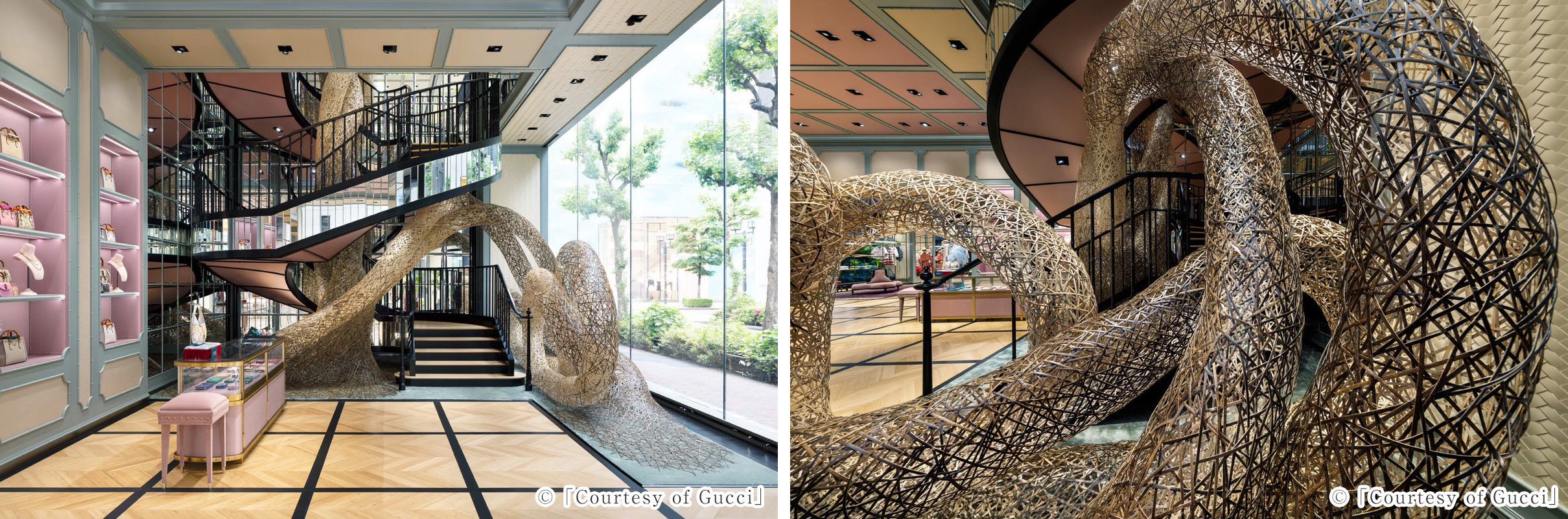 その中でも、今現在でも展示公開中であります、銀座の「GUCCI並木」の店内に、四代田辺竹雲斎様のインスタレーション作品がございます。