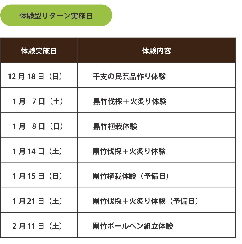 2023/01/07 23:08本日、体験型リターンの黒竹作業体験「伐採+火炙りの体験」を実施いたしました。午前中はあいにくの天気でしたが、時間前には雨も上がり、無事開催することができました。伐採の方の写真を取り損ねてしまった。。。ご参加いただきましたお二方、ありがとうございました。 もっと見る