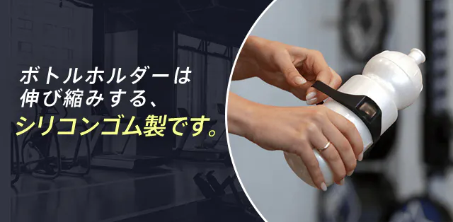 【GYMBUTLER】のボトルホルダーは伸び縮みするシリコンゴム製です。