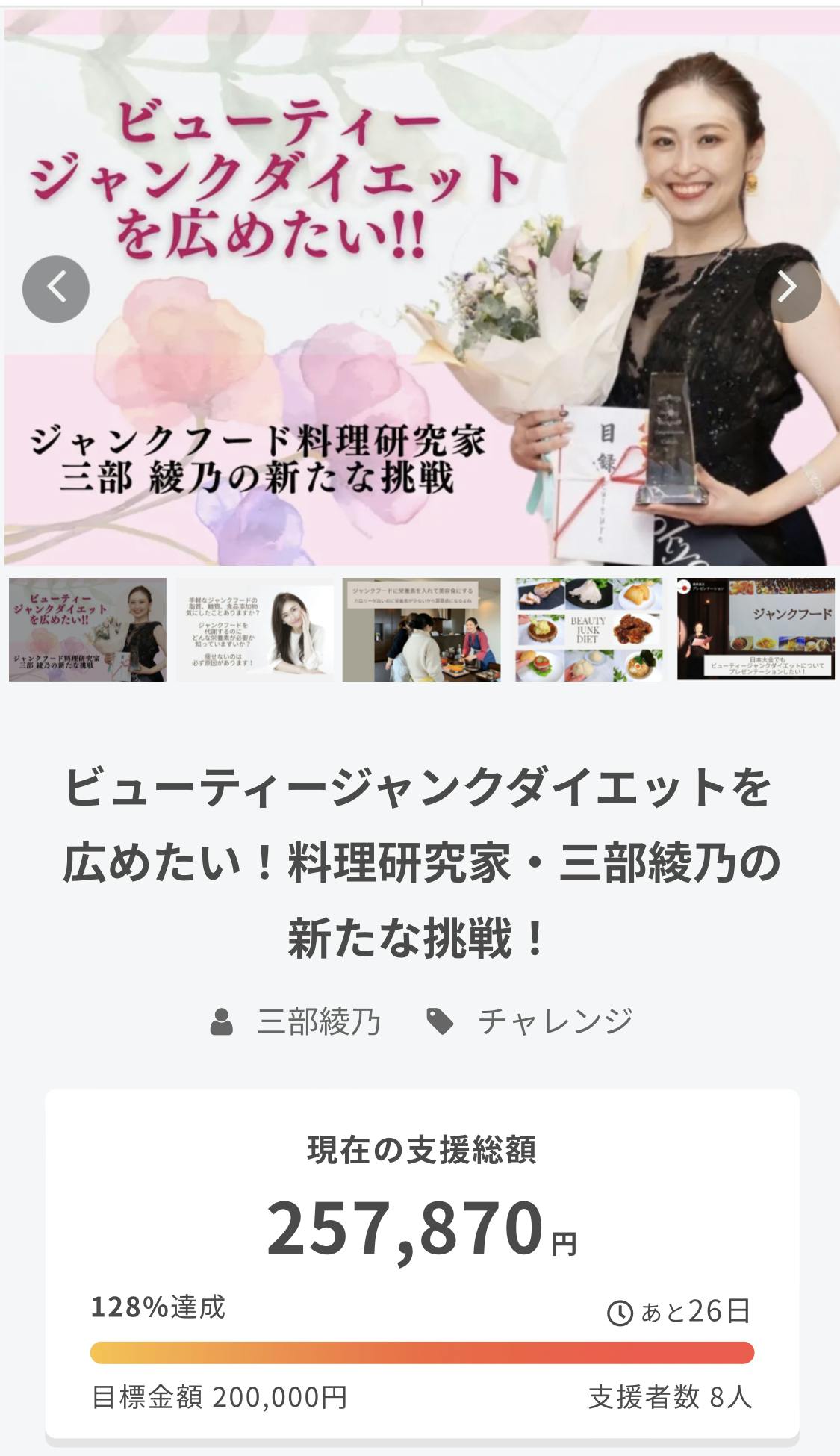 2022/10/04 14:27クラウドファンディングがスタートしました!!現在、自身が考案したジャンクフードの食べ方やデメリットを理論的に学びながら、ビューティージャンクフードに切り替えて克服していく【ビューティージャンクダイエット】を広めていくため、Beauty Japan日本大会に出場しています。東京大会の時とは違い、日本大会で自分の広めたいことを話せるのは、最終審査に残った16名のみです。プレゼンテーションをするためには、事前審査で67人中32位以上に入りテーマスピーチをすること。さらに、事前審査とテーマスピーチの点数を合わせた上位16位に入らないといけません。今年の夏に完全に独立してビューティージャンクダイエット®︎の商標登録も完了し、ここからスタートしていきたいと考えています。多くの方に心も身体も救うビューティージャンクダイエット®︎を広めていくために、大会でこの想いを話したい。今回の事前審査、大会当日は全て地方で開催されるため、交通費や宿泊費、衣装など大会にかかる費用をクラウドファンディングで集めたいと思います。リターンは全部で12種類。気軽にビューティージャンクダイエット®︎を学んでいただける1dayなどもございますので、是非ご覧ください。皆さま、どうか応援をよろしくお願いいたします。https://camp-fire.jp/projects/view/627154 もっと見る