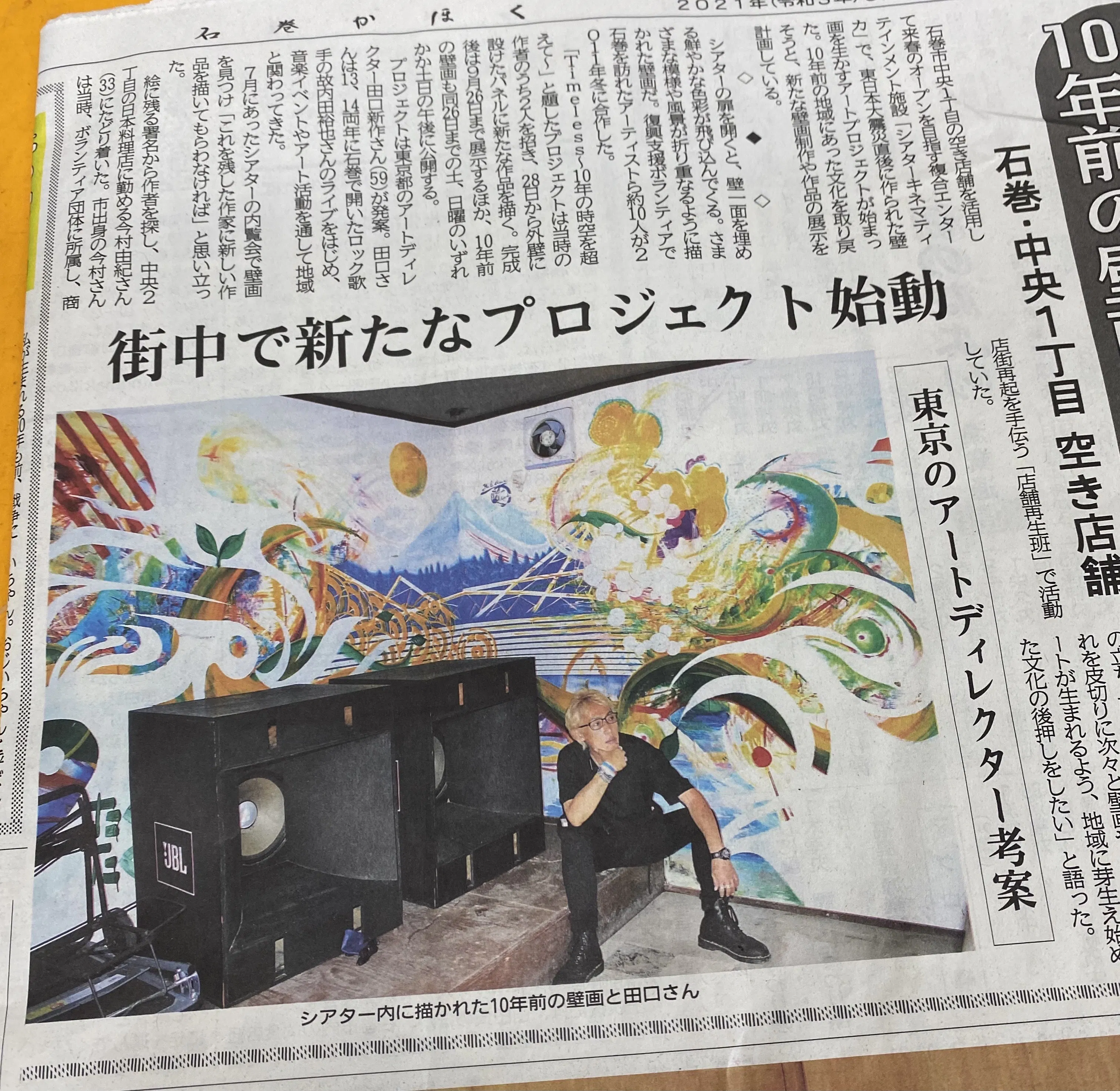 - ことの始まりは昨年の夏、宮城県石巻の市街地からやや外れた場所にある「シアターキネマティカ」と名付けられた古い大きな建物内の一角に、10年前震災ボランティアに来たアーティストたちが記念に描き残した壁画を偶然発見し、その作家たちを探し出して 今度は誰もが見える場所に壁画を描こうというプロジェクトを実施したことにあります。