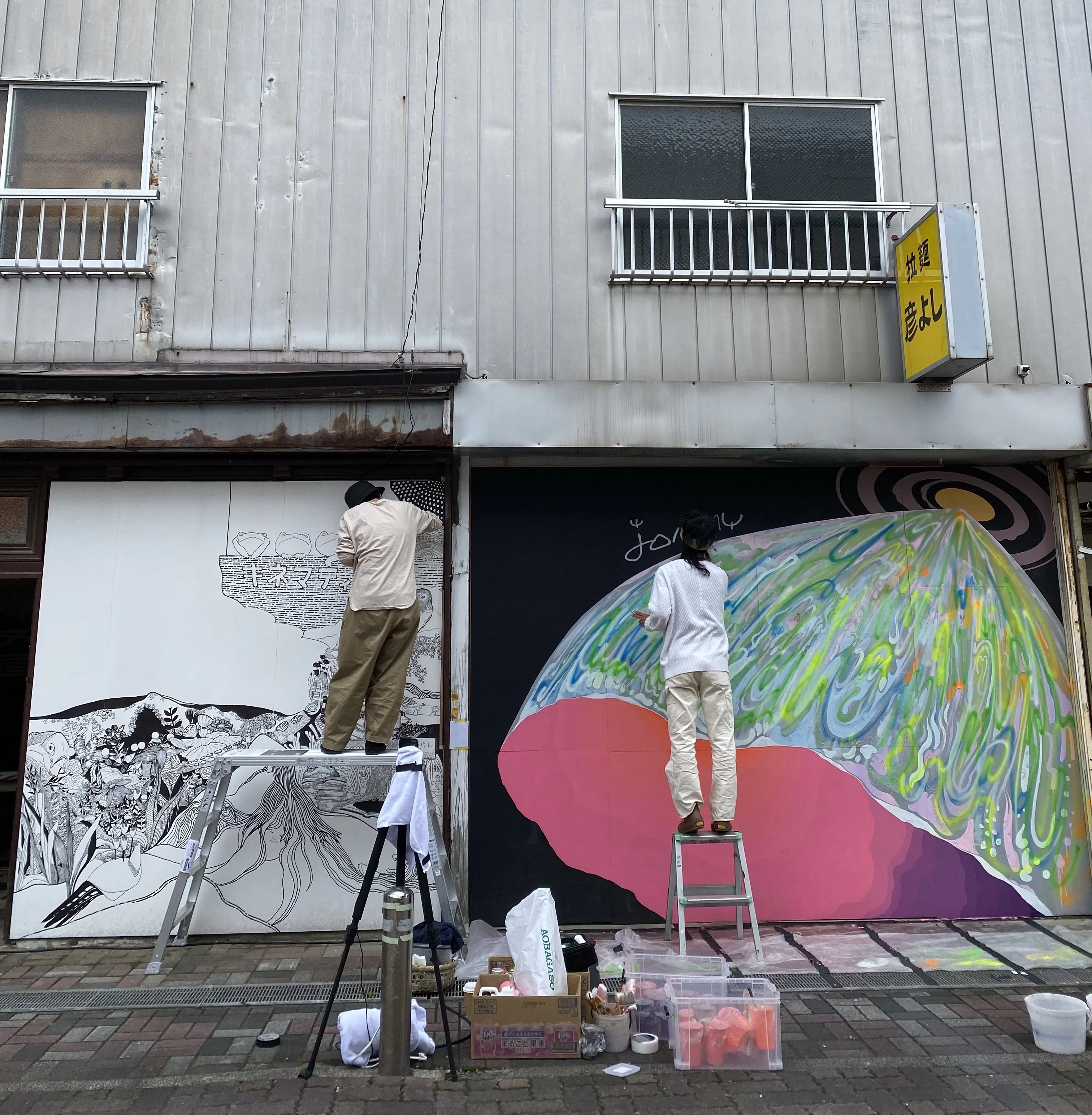 そのプロジェクトとは 石巻で定期的に開催される国内でも最大級の芸術祭とまったく同じ会期で(約50日間)街なかで壁画を製作し展示するというものでした。