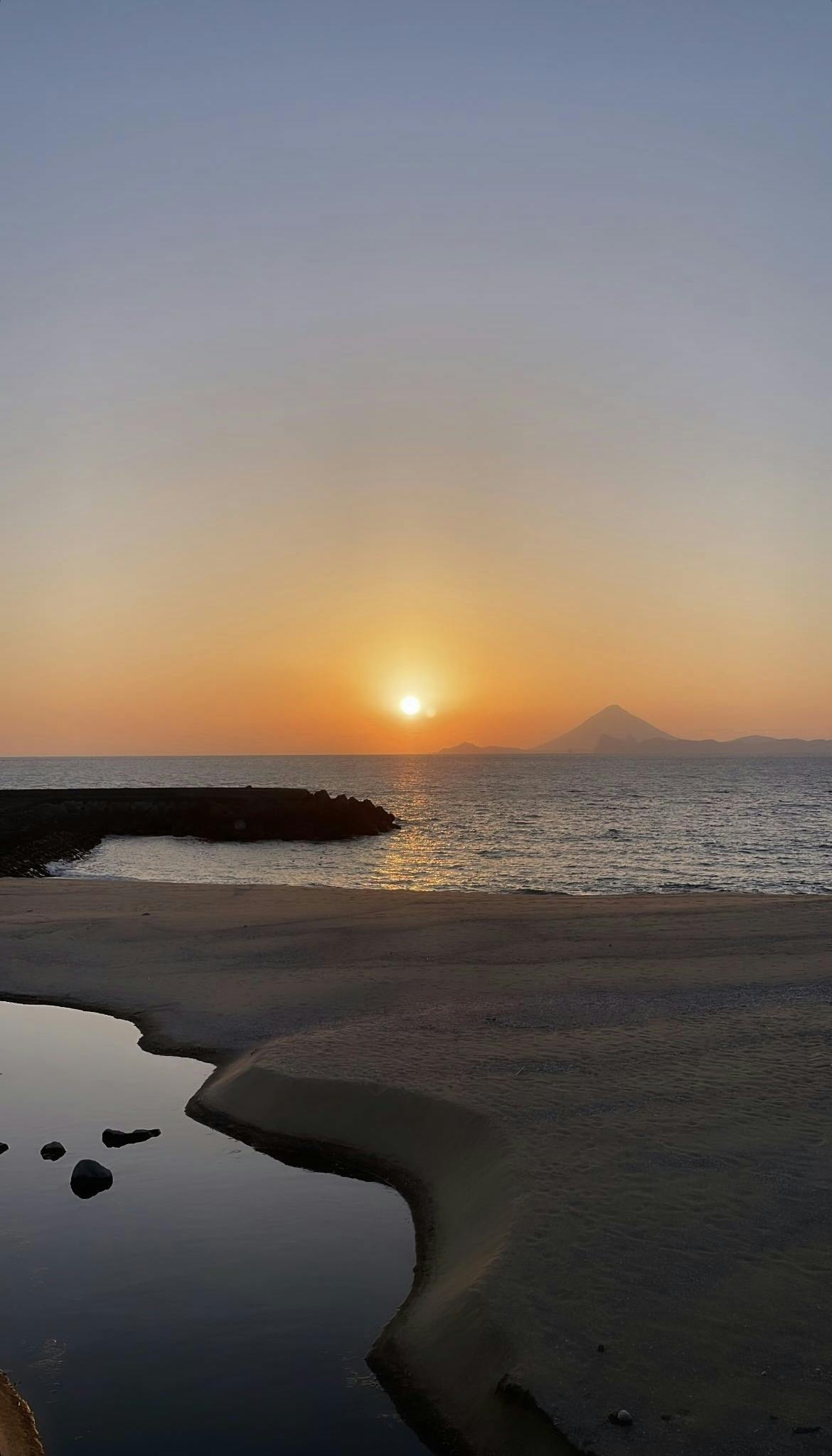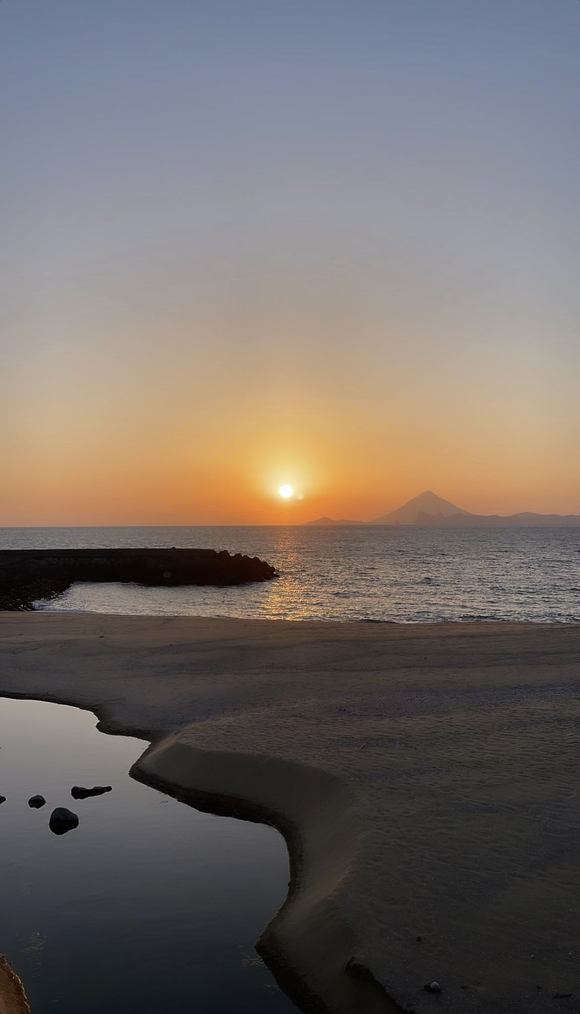 ↓自宅とゲストハウスの前の海。見えているのは開聞岳。夕陽がとても綺麗な町です。
