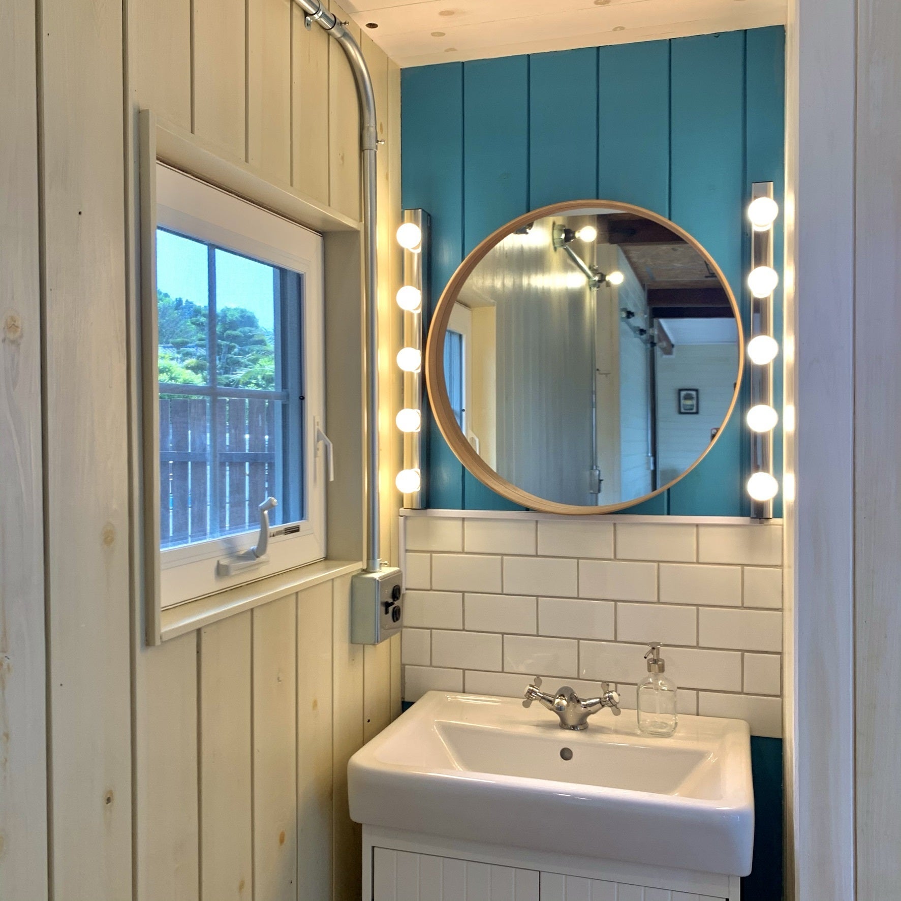 ↑増築した快適な洗面所。拾ってきた流木でライトを作ってお部屋に。折り畳めるテーブルに、ロフトになったお部屋。老若男女皆様が寛いで頂けるように夫婦で考えて創りました。