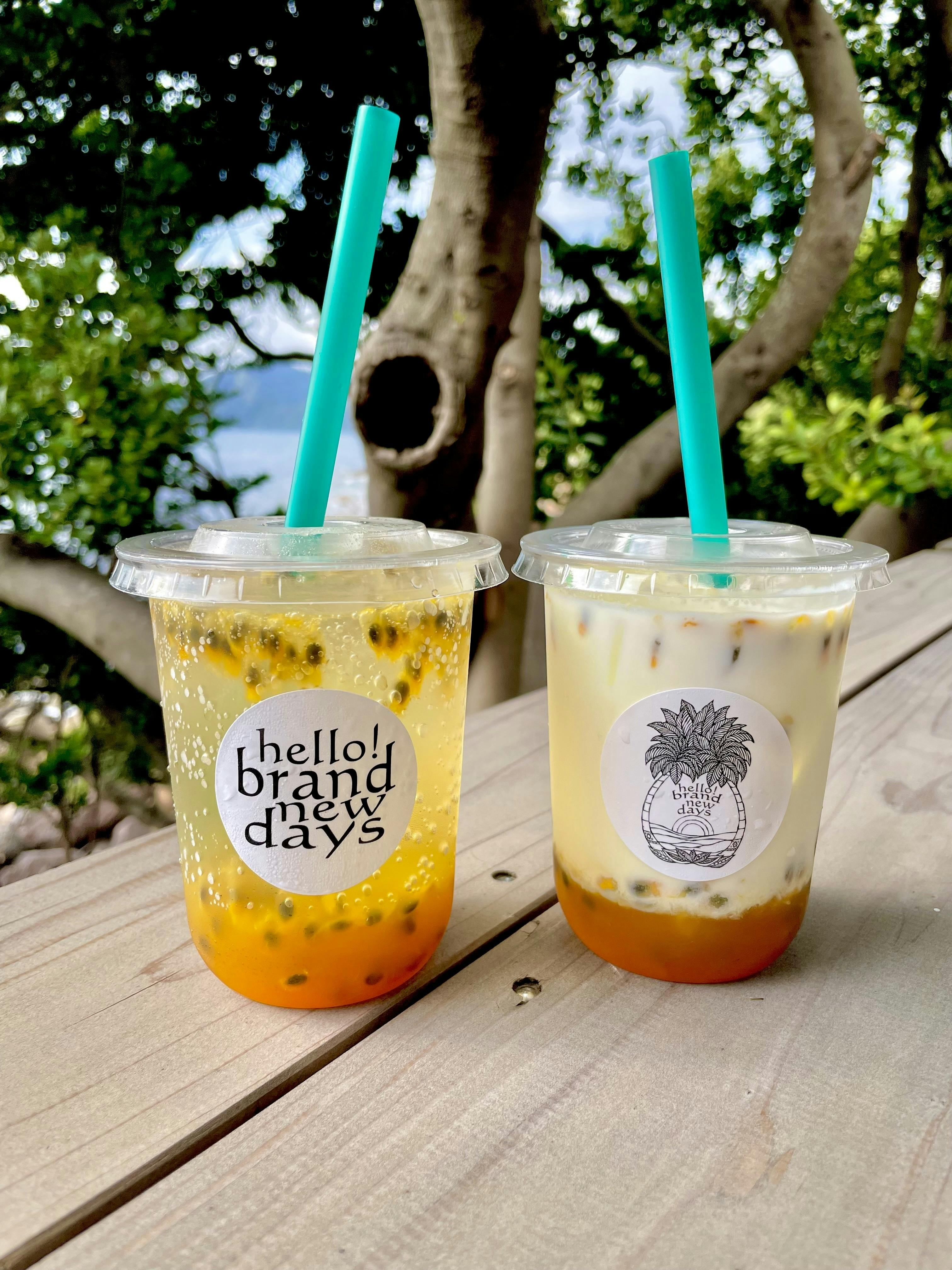 白砂糖不使用の無添加の自家製シロップで作るパインスカッシュ、パインミルク、リリコイスカッシュ、リリコイミルクなど他にも色々なドリンクの形でご提供させていただいております。