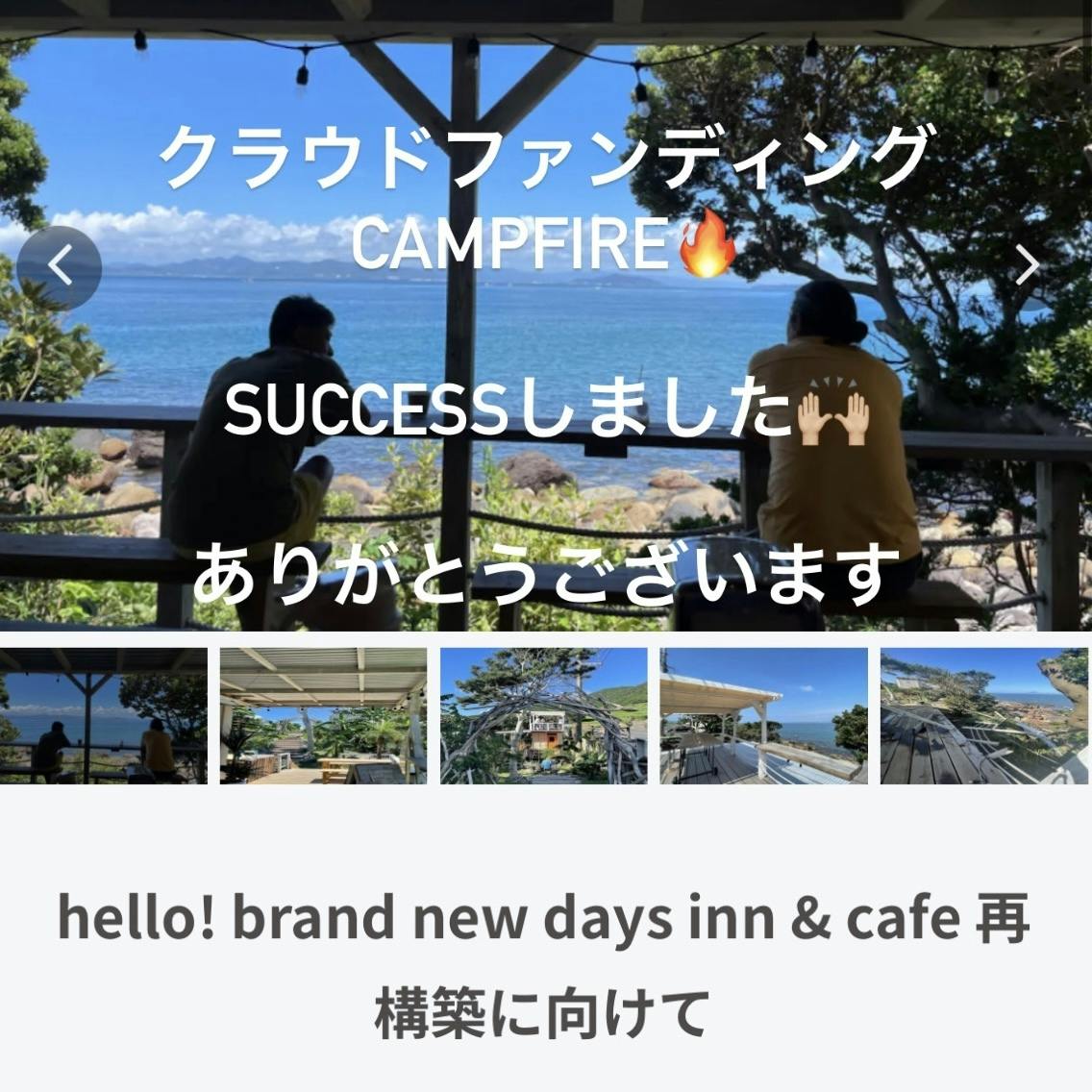 2022/10/19 10:50私達がチャレンジさせて頂いているクラウドファンディングCAMPFIREに沢山の方のに興味をもって頂き、更にご賛同して頂きましてありがとうございます。そして、たくさんのご支援ありがとうございます!ご連絡が大変遅くなりました皆様のシェア、拡散のお力のおかげで開始して間もなくなんと‼三日目にして目標金額に達する事ができました!クラウドファンディング無事、success‼です本当に本当にありがとうございます!想像の域をはるかに超えたスピードで皆様からのご支援と心に沁み渡る応援のメッセージ心より感謝申し上げます。皆様からのメッセージを何度も読み返しています。支援へのリターンだけの事でなく、今以上のサービスや環境の向上を必ず果たせる様に頑張って参りますhello! brand new daysにはたくさんの夢があります。でもそのすべてはお客様と仲間や家族がいてこそみんなで前を向いて進むからこそ叶えられることばかりでした。その夢を守ってくれたのはご支援いただいた方ゲストハウスやカフェに来店してくださった方hello! brand new daysを想ってこれを読んでくださる皆様です。本当に本当にありがとうございました。お客様、ご支援者様、友達、皆さまの生活の中にhello! brand new daysの想いを少しでもおかせて頂けた事、心より嬉しく思い感謝の気持ちでいっぱいです。ありがとうを何度もお伝えしたいです。このプロジェクトを通して本当にたくさんの勇気を頂きました。誠実に、謙虚に、いただいた想いを大切に…hello! brand new daysをこの先 末永く続く、そんな場所になるように努力し続けて参ります。今後ともhello! brand newdaysをよろしくお願いします。2022年 11月20 日 23:59をもってhello! brand new daysのクラウドファンディングは終了予定です。期日までは終了する事はできませんので、残りのお日にちあと32日。まだしばらくございますがどうぞお付き合い頂けたら幸いです。success後も有り難いことに、毎日支援の報告を頂いております。ありがとうございます。目標金額を超えたご支援分は…実は、台風の被害で壊れてしまっているパイナップル農園のビニールハウスの修繕費や、ゲストハウスの施設をより快適に過ごして頂けるようにとさらなるサービス向上に向けてご支援金を全額使わせて頂きたいと思っています。そして、想定外にご支援頂いた場合は…次の私達の計画。。『もう一つのhello! brand new days inn』に向けてのインフラ工事等にも、少し使わせて頂だけたら…と、思っております。 違う土地にて温めている計画がございます。そちらの場所や内容は、またきちんとお伝えさせてくださいね!今のゲストハウスでは無理だったペットと泊まれたり…テントを張ったり…砂浜で焚き火をしたり…8名様以上でのご利用…お客様の意見や理想いろんな夢をまた現実にできる様な新たな事も考えております。そんなプロジェクトにも是非ご賛同して頂けたら幸いです!あと32日間でのご支援にもよりますが、全てのご支援をhello! brand new daysのさらなる力とさせて頂きます。これからのhello! brand newdaysを通して皆様に恩返しできる様頑張ってまいりますね。長くなりましたが、successのご報告。感謝のお気持ちを伝えさせて頂きました。ありがとうございます!濱田 龍也、香織 もっと見る