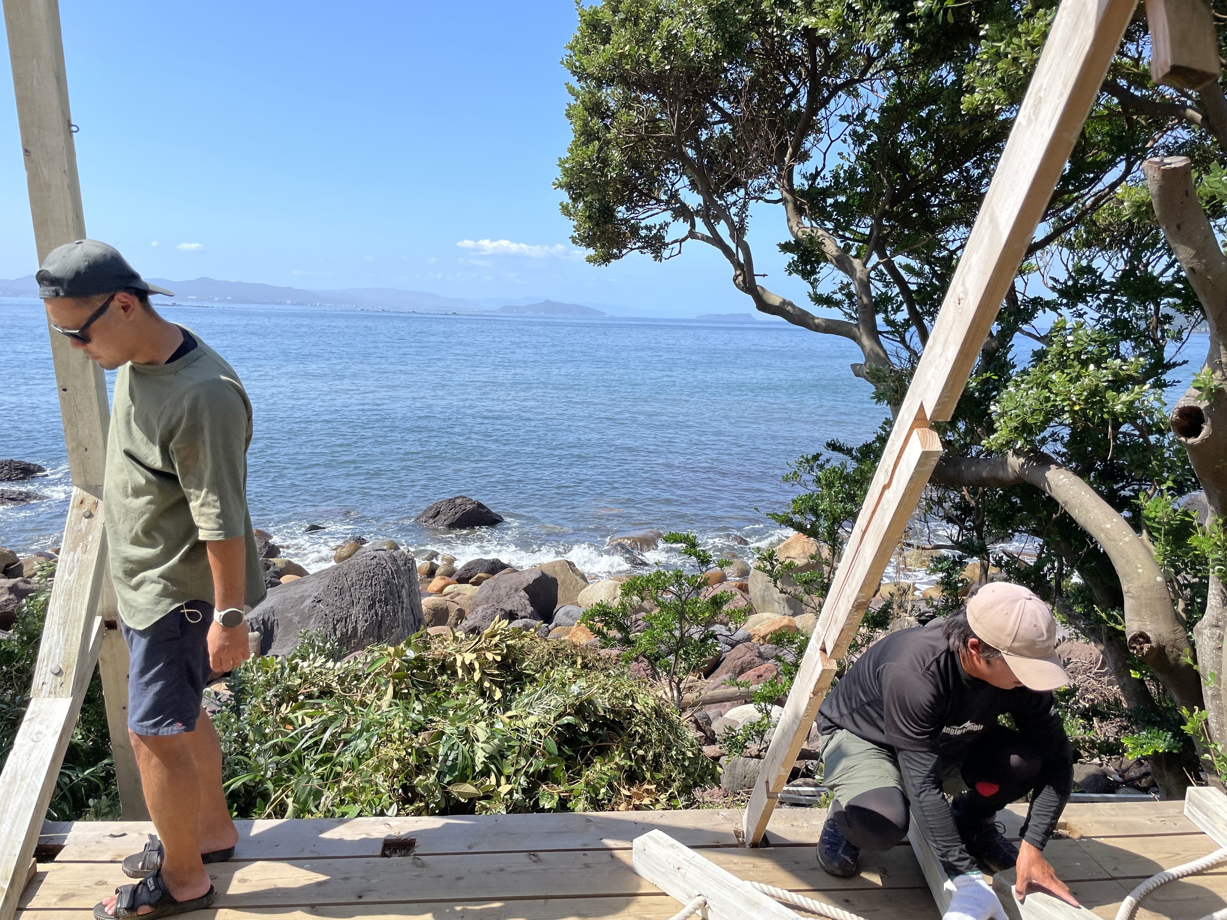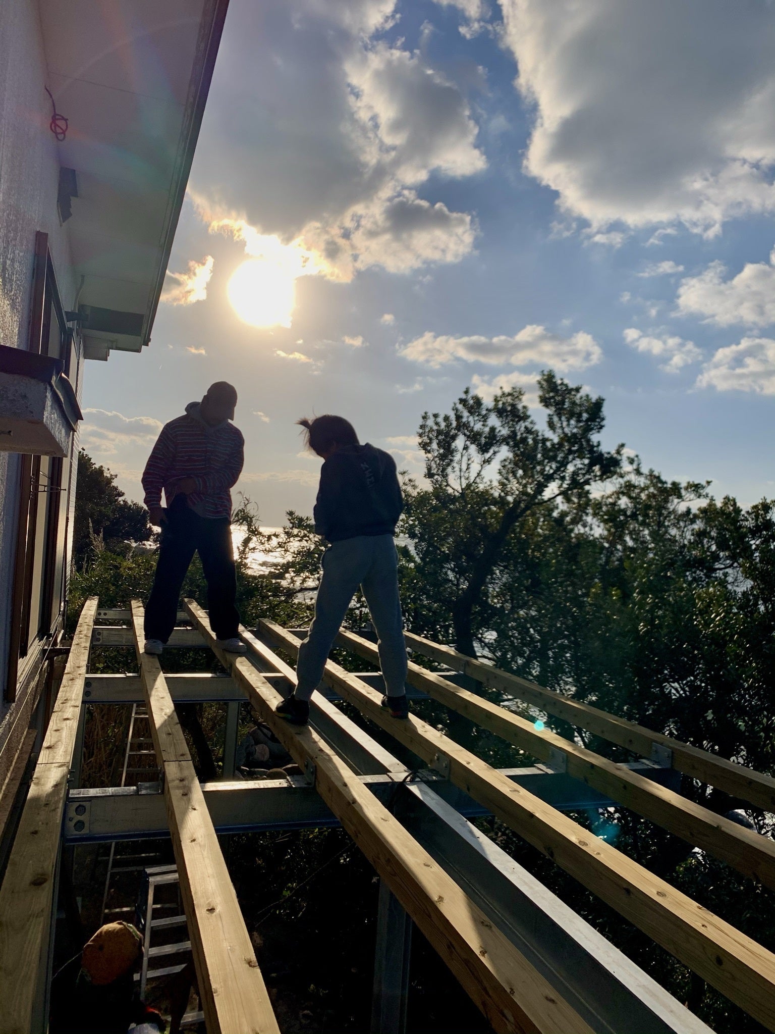 壊れたものや海や他の場所へ飛んでいってしまった廃材の撤去や解体をしに、すぐに駆けつけてくれた友人達↓