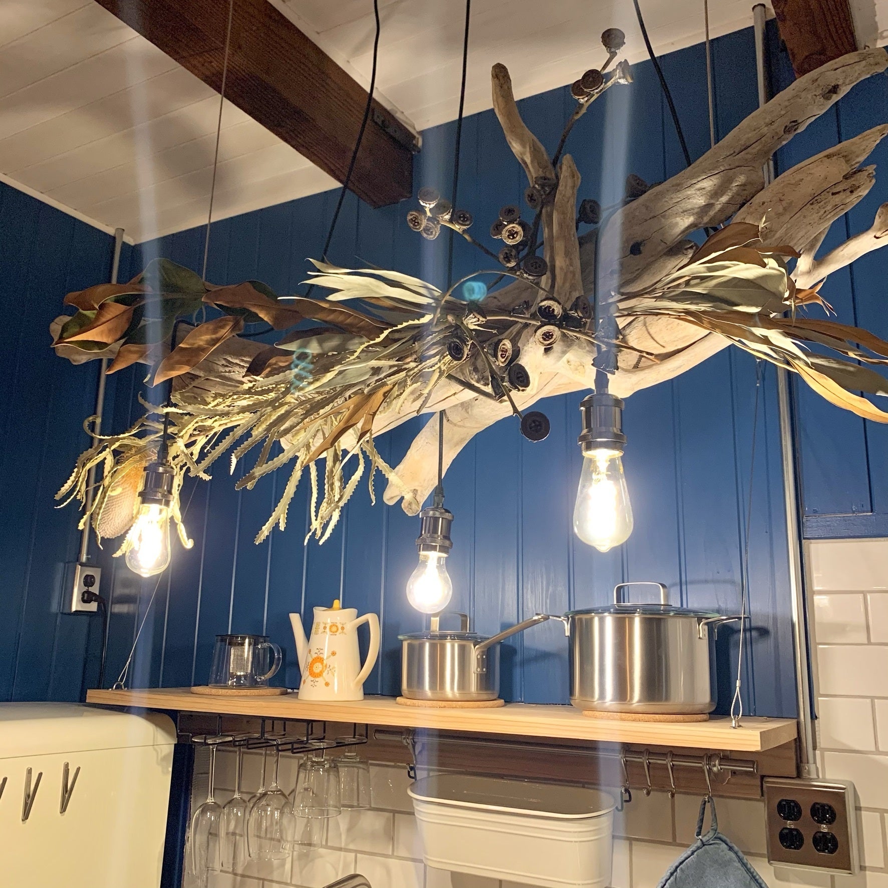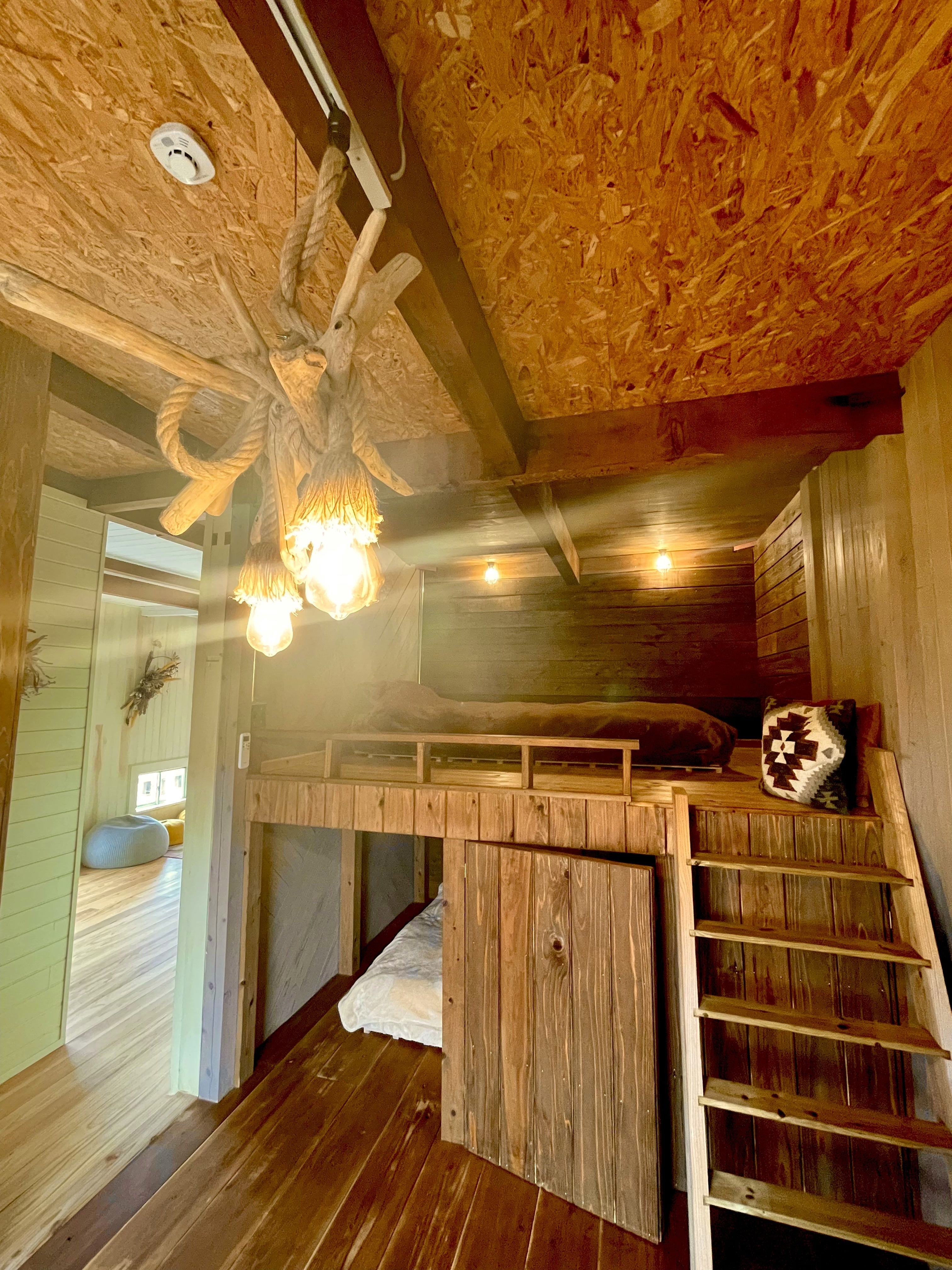 ↑増築した快適な洗面所。拾ってきた流木でライトを作ってお部屋に。折り畳めるテーブルに、ロフトになったお部屋。老若男女皆様が寛いで頂けるように夫婦で考えて創りました。