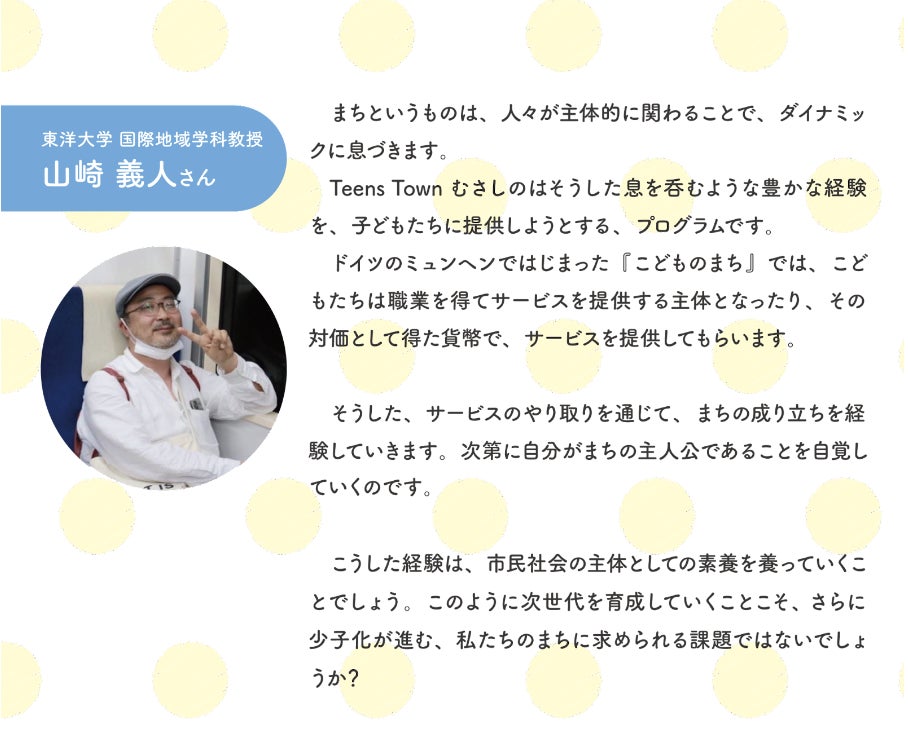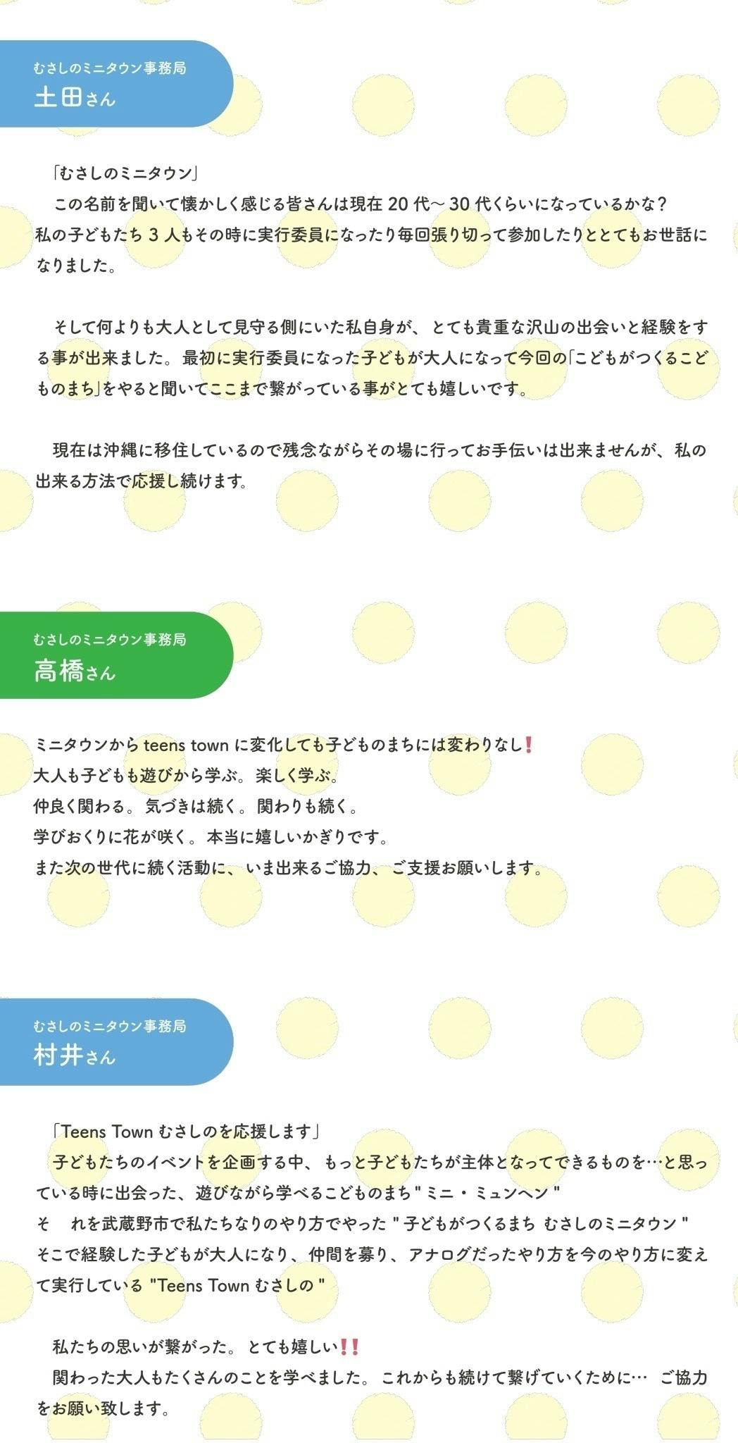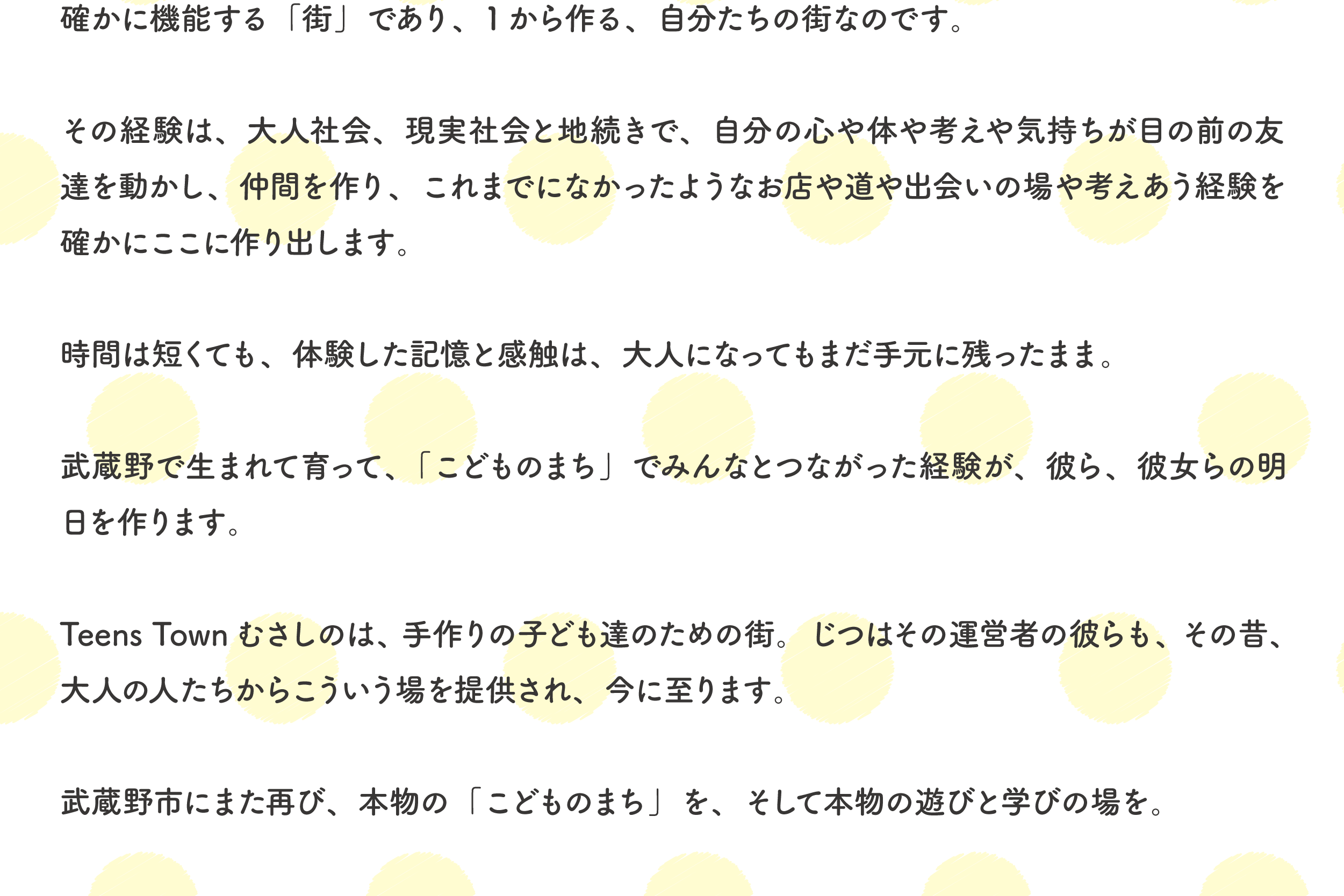 事業を終了してしまったこの「むさしのミニタウン」ですが、仲間と共に実践しながら、企画書を作り、みんなで会議をしてこどものまちをつくる経験はかけがえのない思い出となりました。そんなこどものまちでの経験がきっかけで、大学でまちづくりを専攻し、TeensTownを立ち上げ・・・いつのまにかまちづくりという途方もない航海に乗りだしていたようで、波にさらわれそうになりながら進んできています笑