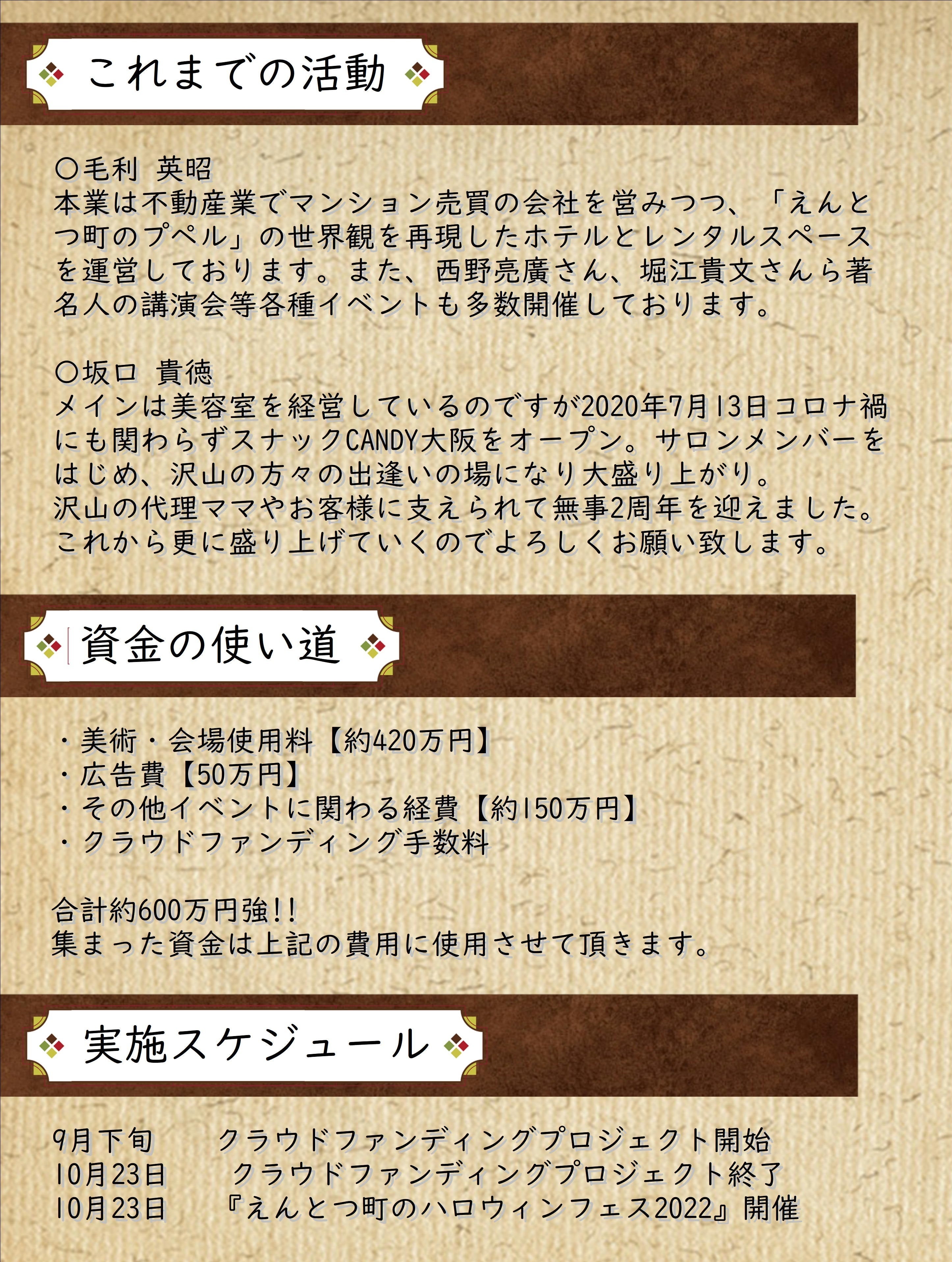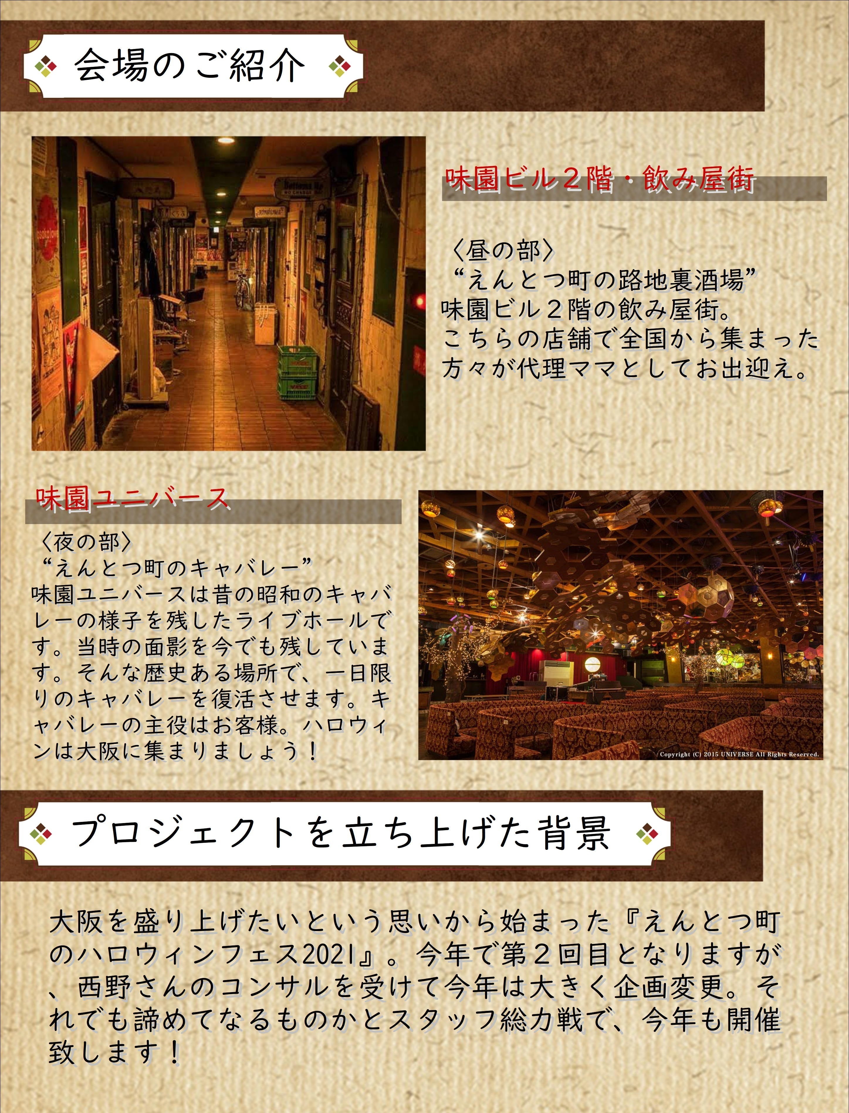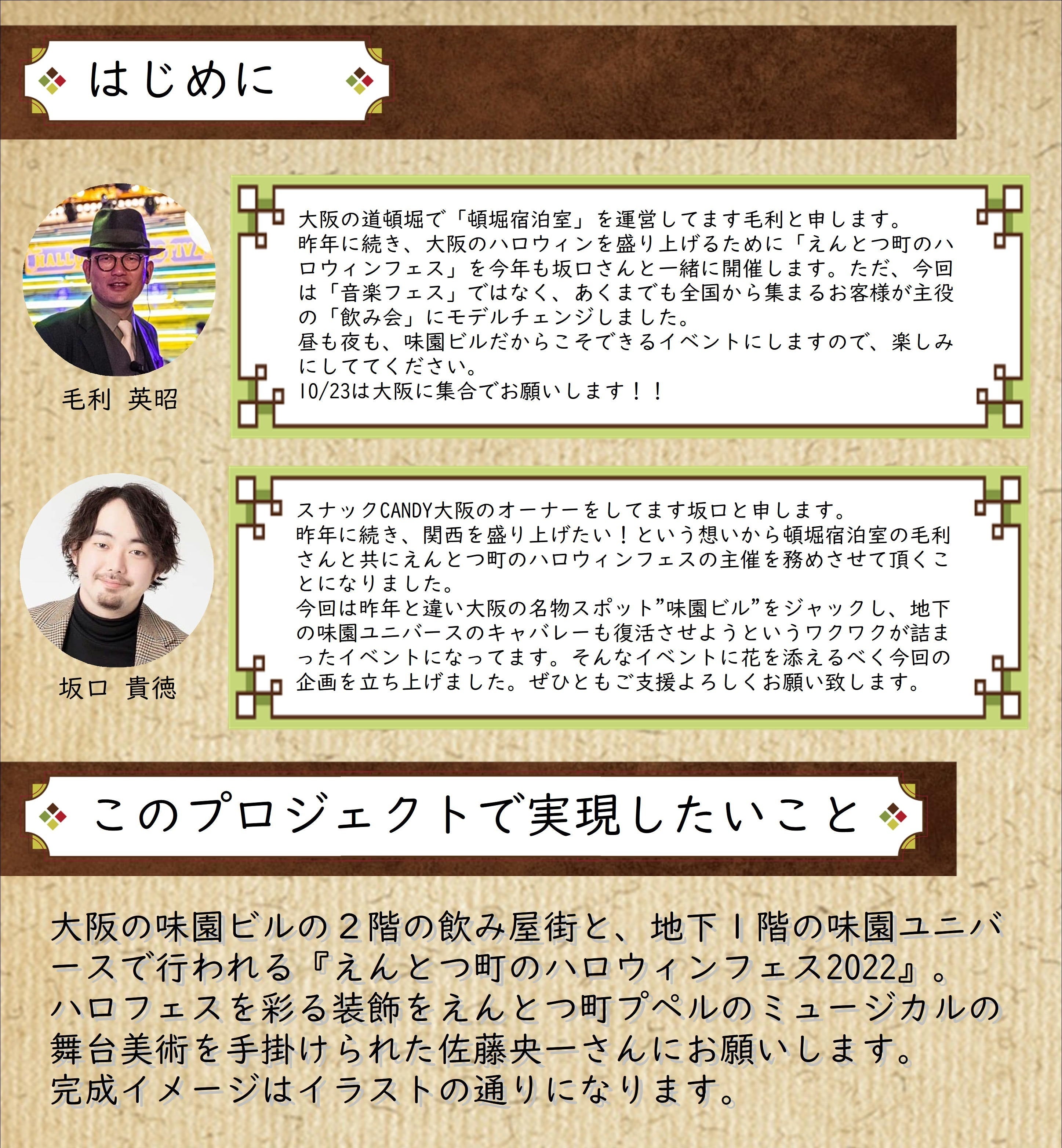 「大阪のハロウィンを取りに行く!」大阪でハロウィンといえば、味園ビルでの『えんとつ町のハロウィンフェス』ではしご酒とキャバレーというのを文化にしたい。全国から沢山の仲間が集まる待ち合わせ場所として、笑顔溢れる空間をみんなでハイボールを飲みながら分かち合うイベントとして、今後とも毎年恒例行事として定着させたいと思ってますので、是非ご支援のほどよろしくお願いいたします!