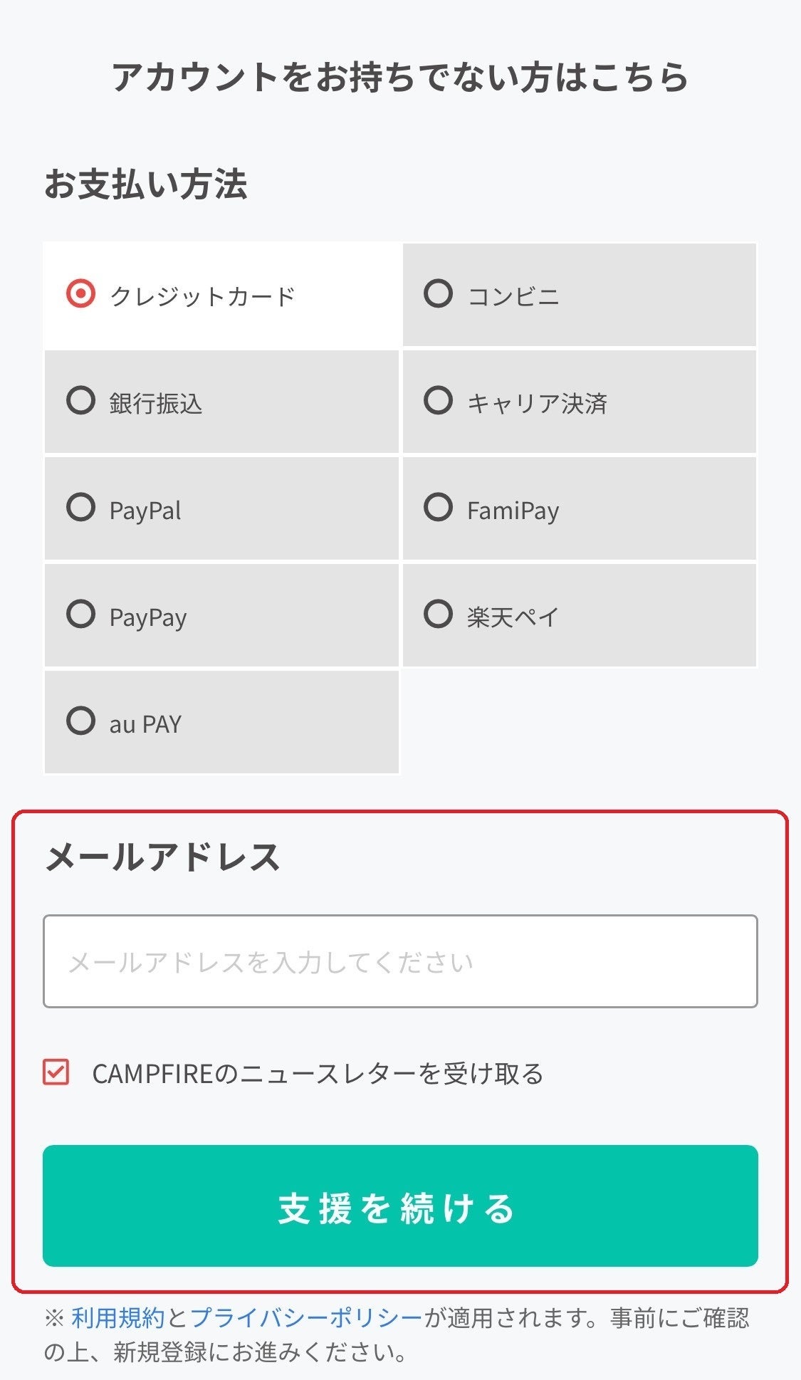 ページ下部へスクロールして、「アカウントをお持ちでない方はこちら」の下部より支払方法を選択し、メールアドレスを入力、「支援を続ける」ボタンをクリックします。