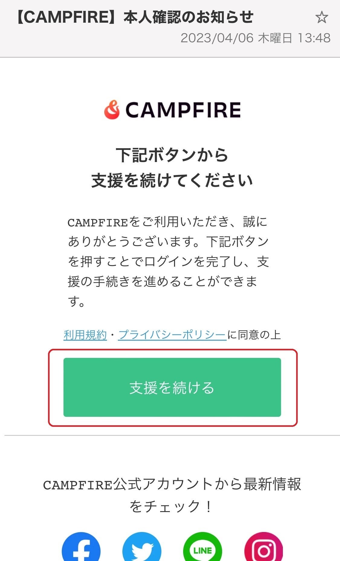 送られてきた本人確認メールを開き、「支援を続ける」ボタンをクリックします。
