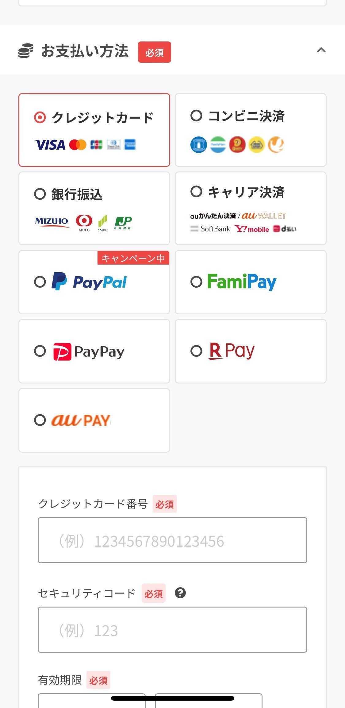 支払方法を選択し、情報を入力します。