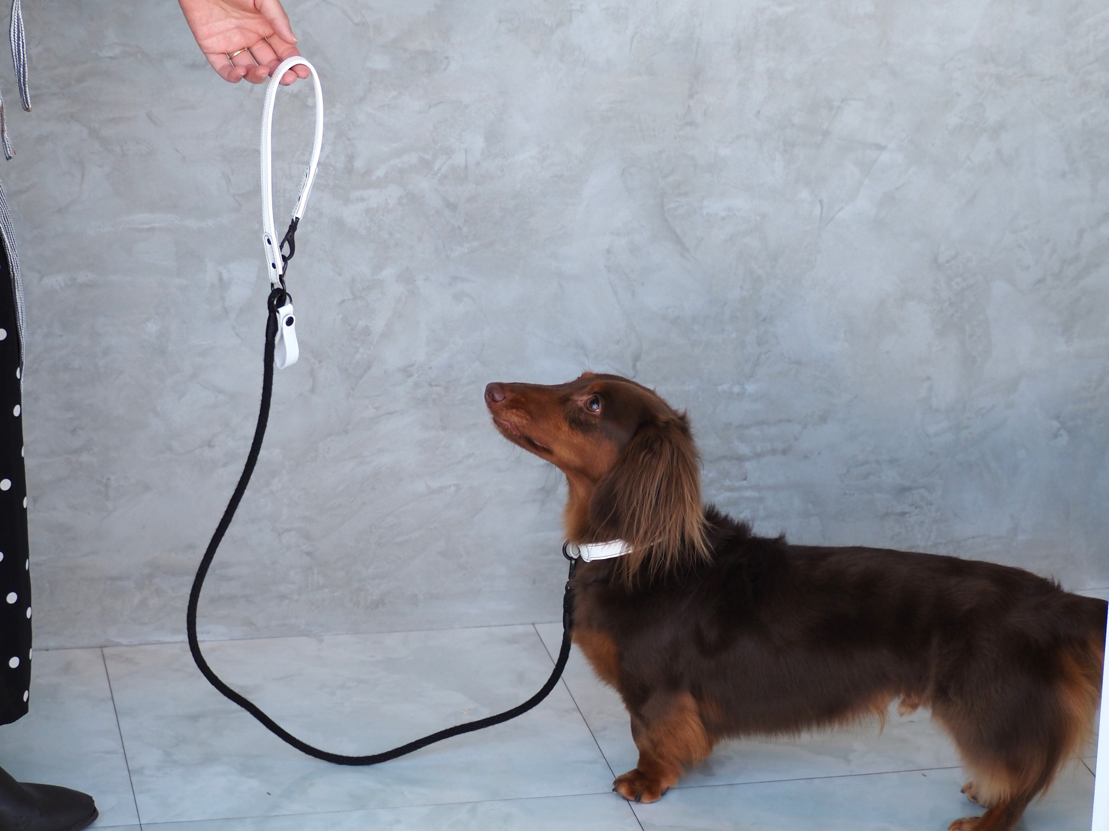 ワンちゃんのお散歩時には必須アイテムであるリード。持ち手部分の形や太さ、ロープ部分の素材や長さなど試行錯誤し、形が出来上がるまで1番苦労したのがリードかもしれません。試作品の数々最も考慮したのが、金具と革や紐の接続部分や紐自体の強度でした。負荷のかかる部分ですので、犬具のオリジナルブランドを持っていて実績のある企業さんに製作をお願いしました。鹿革は持ち手部分に採用し、優しい触り心地になっています。ステッチはオリーブグリーン。ロープ部分(紐)は、柔らかい麻のような触り心地の黒いクレモナを使用。強度・耐久性があり濡れても大丈夫な素材です。THREEAWEのロゴが入った牛革のストラップが付いているので、リードをくるくるっとまとめて留めておくことができます。金具類も黒に統一し、高級感というよりはアクティブっぽさを感じるカラーリングになっています。一般的に金具として使用されている「鉄砲ナスカン」は、犬用首輪との相性は悪く、お散歩中に外れる可能性があったり耐久性にも不安があります。そこでTHREEAWEでは、「レバーナスカン」を採用しています。サイズは、長さ1180mm(持ち手含む)×紐の太さ8mm(持ち手幅12mm)となっています。暖かくなり、お散歩やドッグランへ出かけたくなる季節。THREEAWEの首輪やリードを使って自然の中で遊んでくれたら嬉しいです。