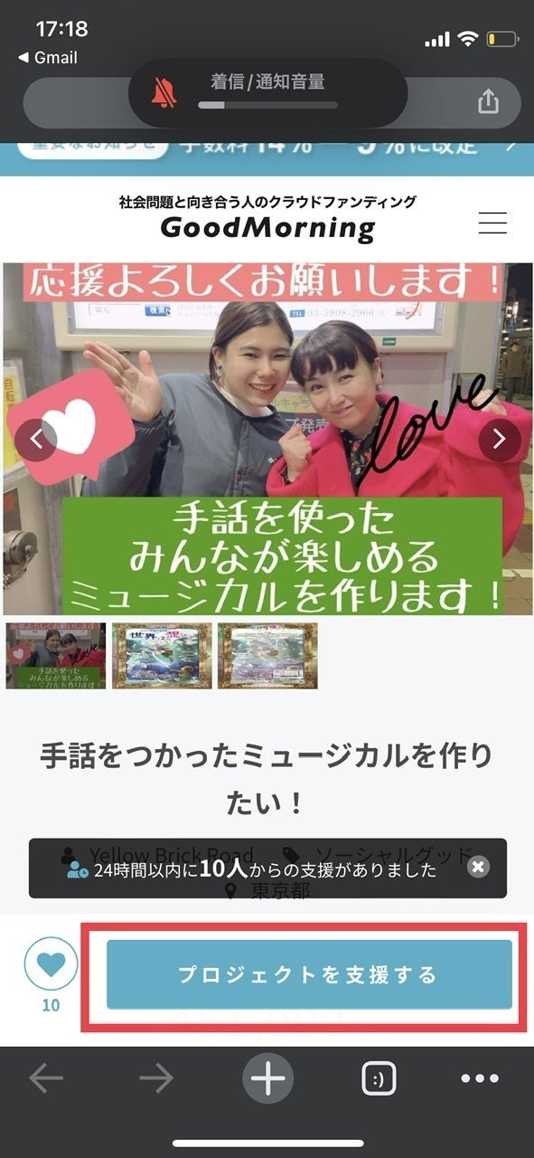 1.クラウドファンディングサイトを開き、「プロジェクトを支援する」を押す(クリックする)