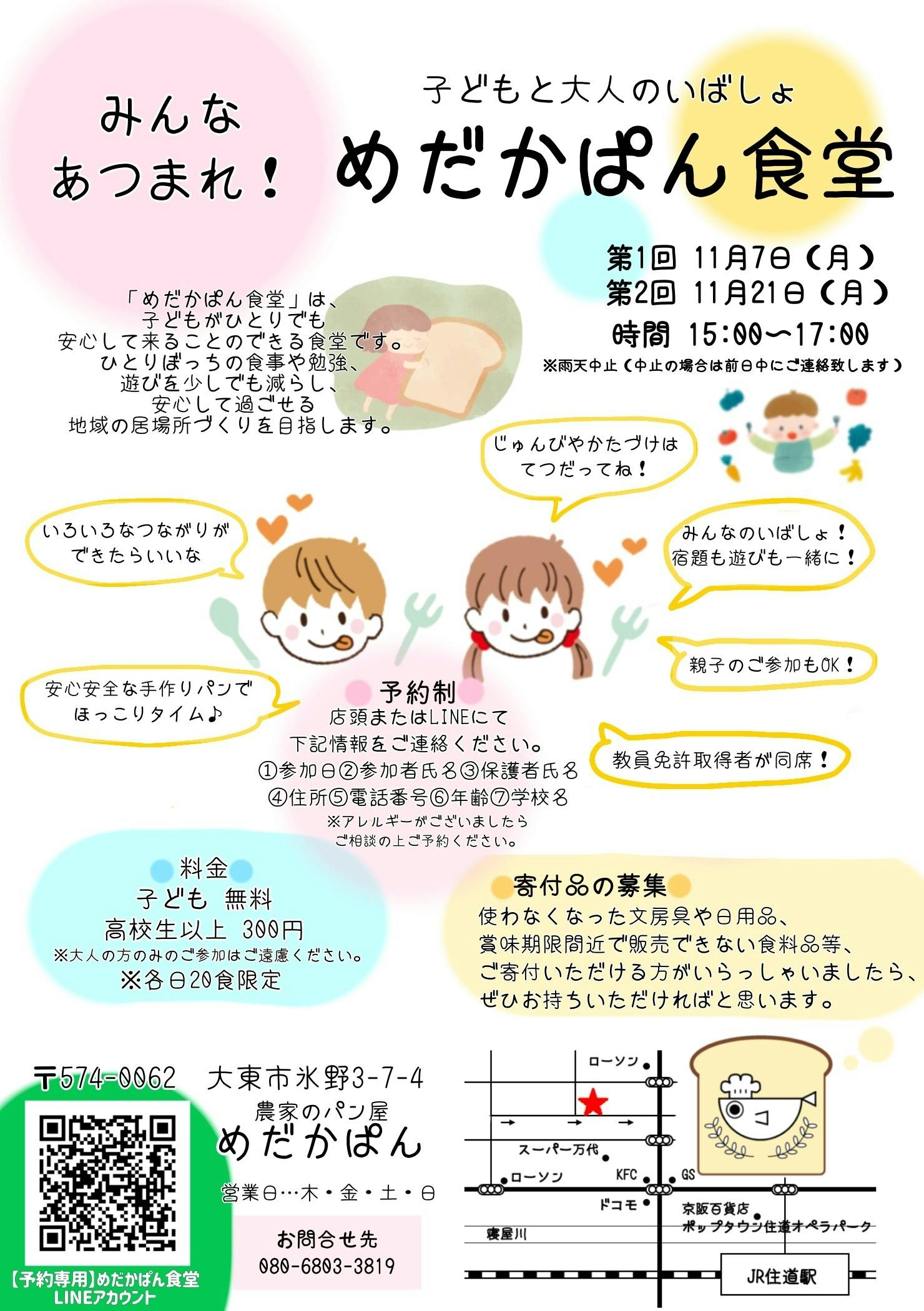 めだかぱんの子ども食堂「めだかぱん食堂」の実施スケジュールにつきまして、10月中に第1回、その後、月1〜2回実施予定としておりましたが、変更となりましたので下記の通り訂正申し上げます。