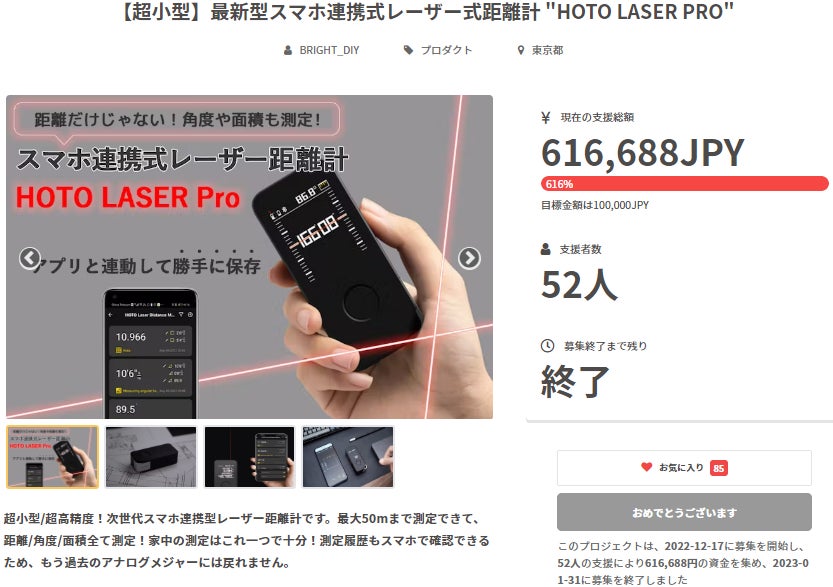 皆様にご満足いただけるリターンをお届けできるよう、全力で取り組んで参りますので引き続き、【超小型】最新型スマホ連携式レーザー式距離計 "HOTO LASER PRO"をよろしくお願い致します。