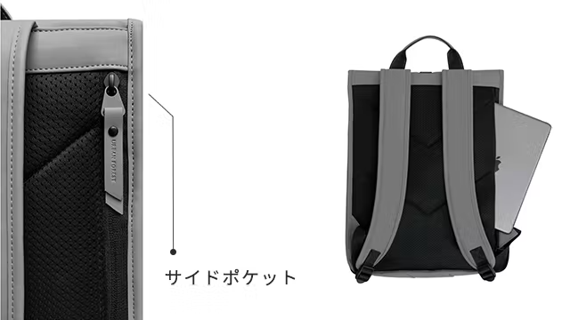 バックパックを背負ったままきちんとものを取り出しやすいように、サイドポケットを採用しました。またファスナーが付いていて、物が落ちる心配もなし!