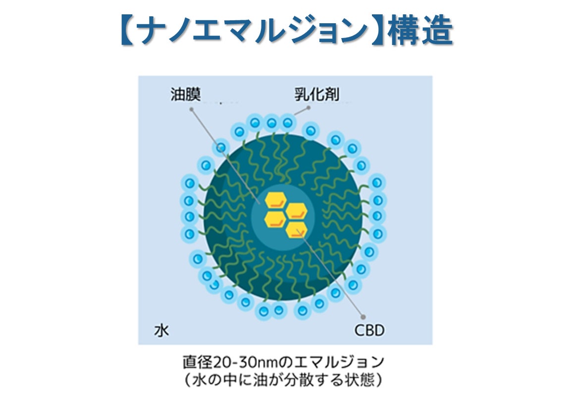 CBDの分子をナノサイズの粒子に分解した上で、それを乳化剤で覆います。この状態をナノエマルジョンと呼びます。食品や飲料業界では一般的であり、水と油が同時に存在するようなミルクやマヨネーズなどの身近な製品もこの状態です。