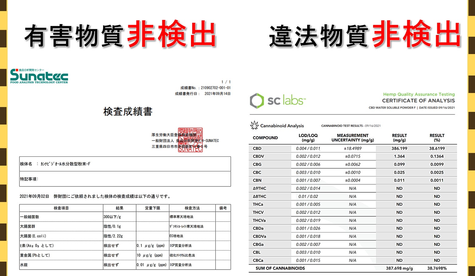 厚生労働省や食品検疫所の正規の手続きを経て輸入をしており、食品としての使用可能な原材料です。テスト結果(CoA)等も含めて透明性を持った情報提供を行い、信頼できる原料を使用しております。