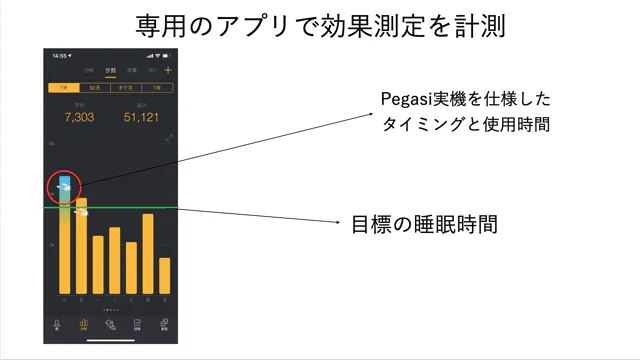 上記のデータ計測によって、Pegasiの使用と自分の睡眠の変化の関連を見ることが可能です。