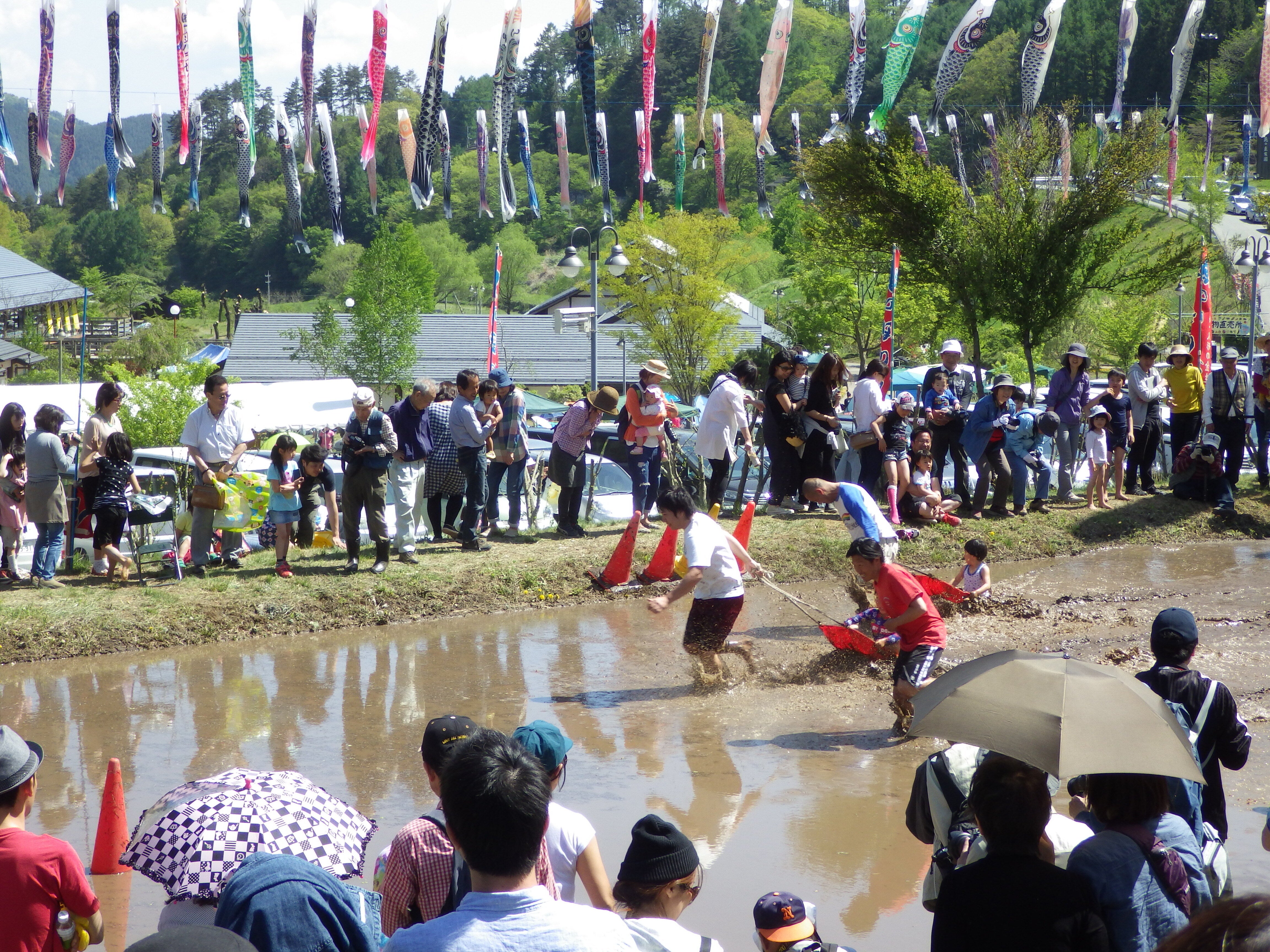 そして、この地ならではの棚田を活用した「泥んこカヌーレース」や「鯉のつかみ取り」を実施。