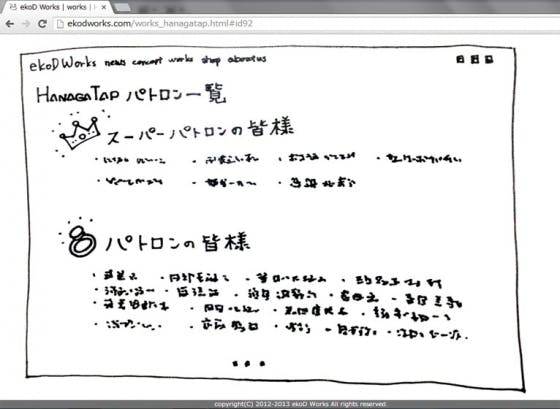 2013/05/02 19:13全支援者様対象のリターンとして設定している 「製品サイトへのお名前掲載」用のページをご用意いたしました。 プロジェクトサクセスの暁には、こちらにパトロンの皆様のお名前を掲載いたします。 サクセスしなかった場合、このページはなくなってしまうことでしょう。 http://ekodworks.com/works_hanagatap.html#id92 もっと見る