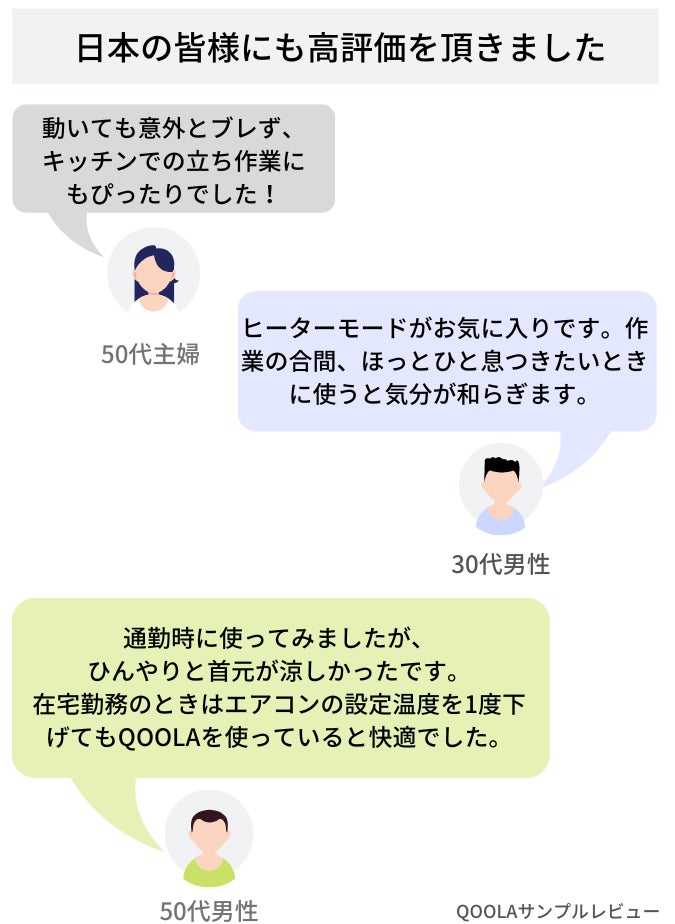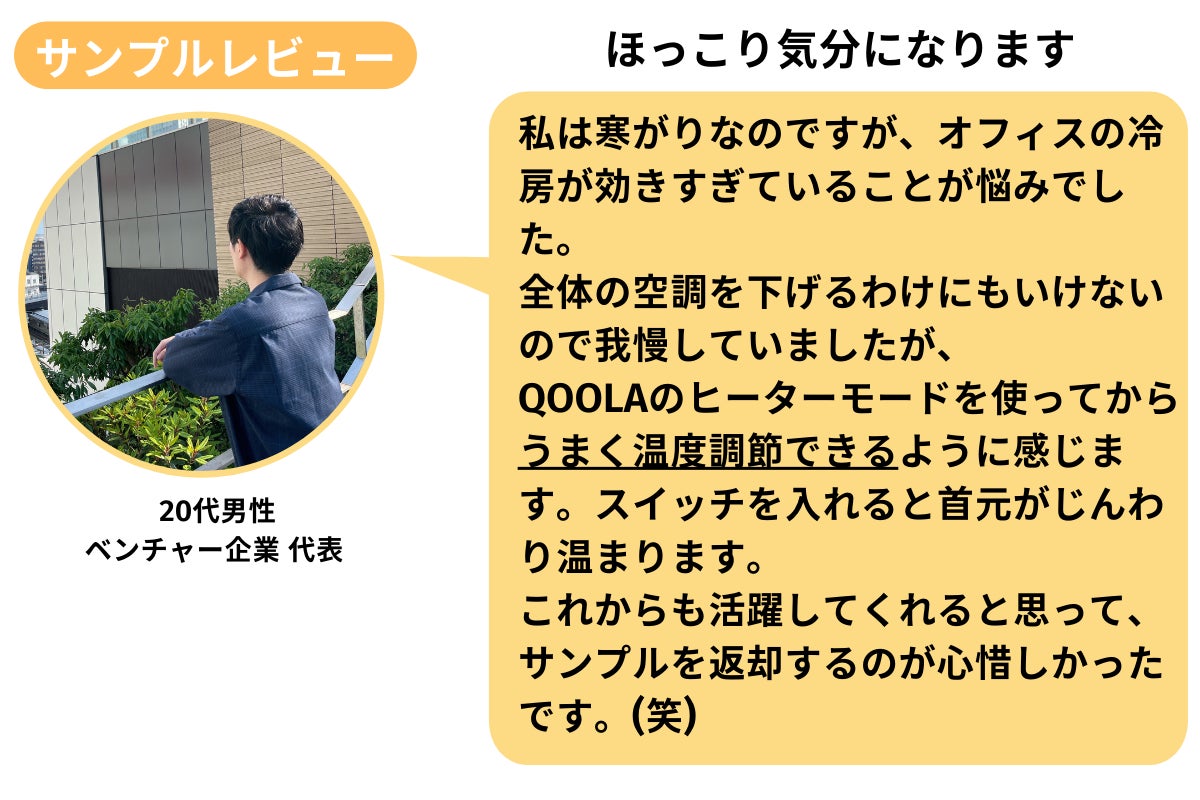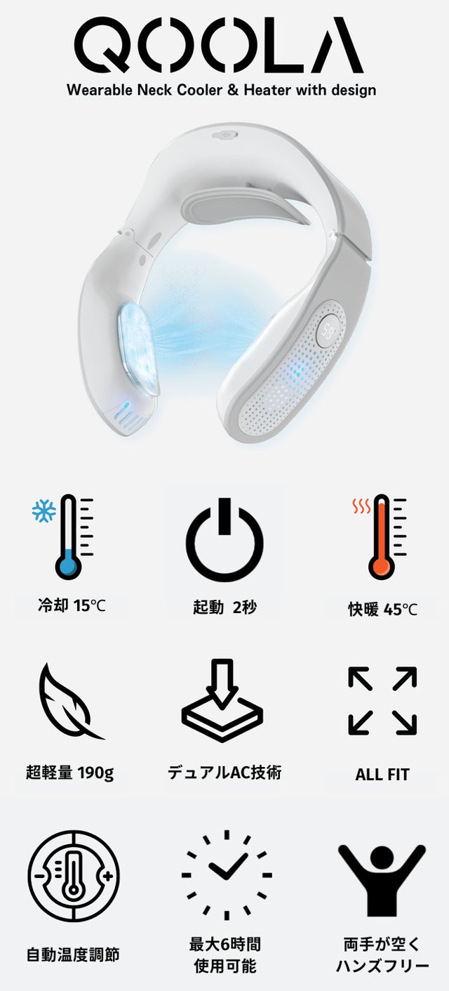 わたしたちは温度調整できるデバイスとして1年間を通してサポートできるようなものはないかと思い、この商品に至りました。本プロダクト”QOOLA“ は高性能で携帯性にも優れ、見た目もスタイリッシュ。街中でも気軽に使えるような、まさに私たちが探していたネッククーラー&ヒーターでした。1年間を通してQOOLAの快適さを実感していただきたいと思います。