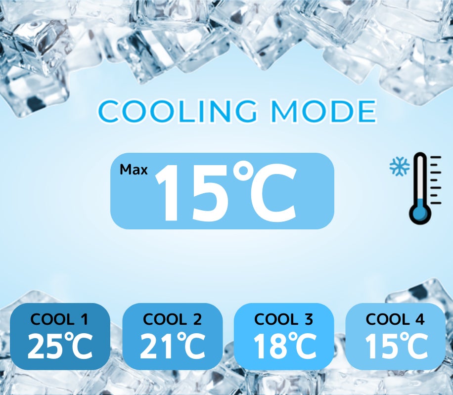 4段階の冷却モードと温熱モードを搭載し、冷却は最低で15°C、暖房で最高で45°Cまで調節が可能です。