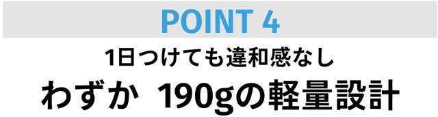 重量は缶コーヒーよりも軽い、わずか190g。この軽量設計のため、1日中つけていても違和感を感じさせません。