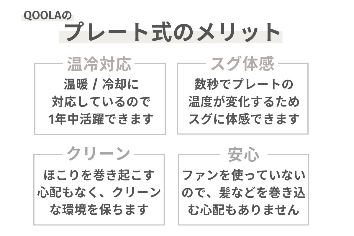 QOOLAは十分な涼しさや暖かさを確保しながらも動作音は25~30デシベル程度で風なし静音設計。