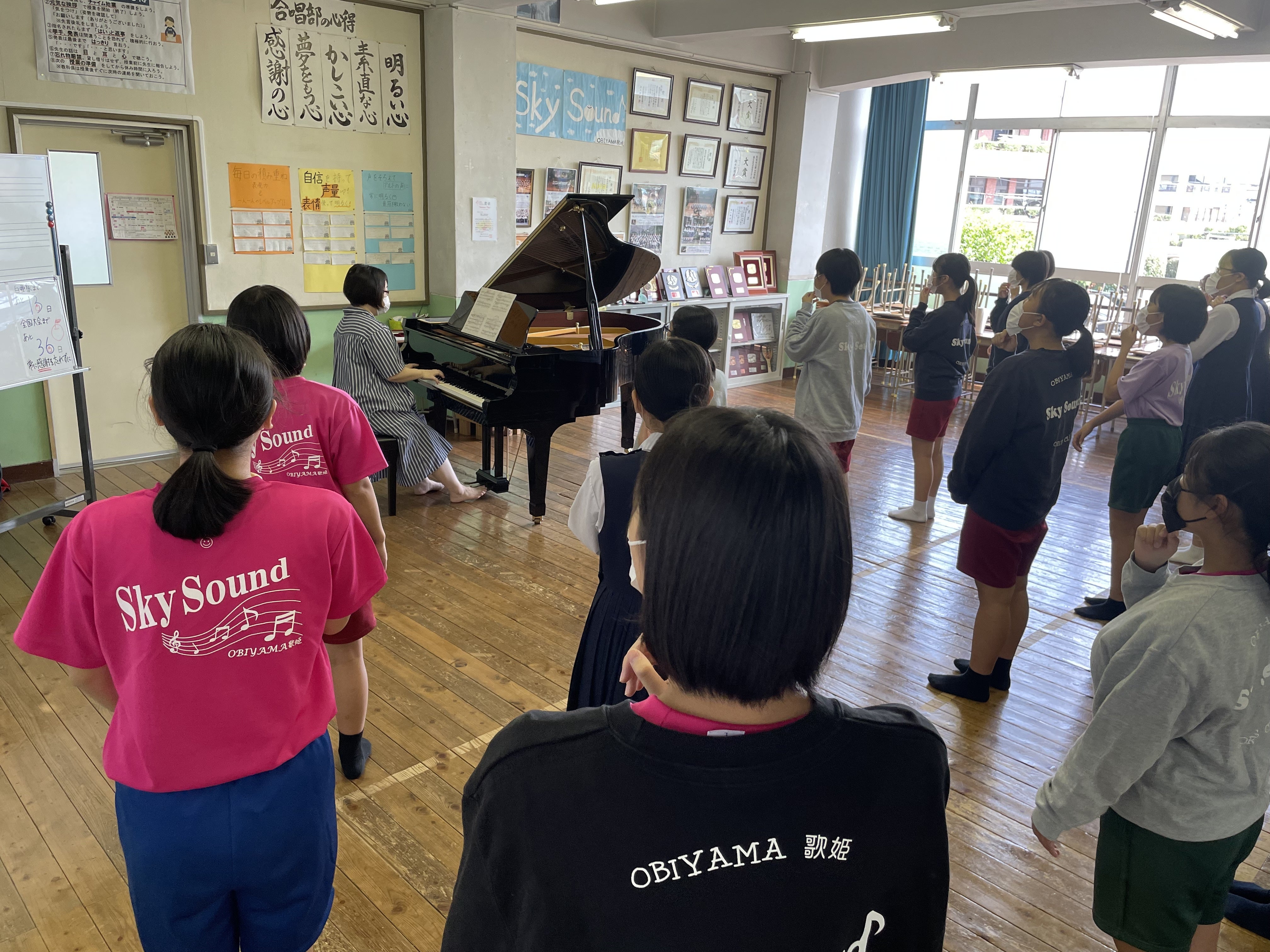 私たち帯山中学校合唱部は『Sky Sound』をモットーに楽しく活動しています。現在在籍している部員21名は、入部時からコロナ禍で活動を続けている世代です。コンクール中止、無観客開催、マスクを装着した歌唱...様々な制約がある中、応援し支えてくださる方々への感謝の気持ちを忘れず、心に響く音楽づくりを目標に日々練習に励んでいます。