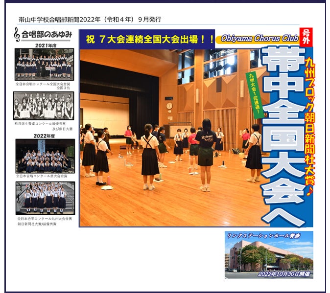 また、コロナ禍でひたむきに活動を続け、全国の強豪校とのステージに臨む『帯山中学校合唱部』の雄姿を広く皆さまに知っていただく機会になればと願っています。