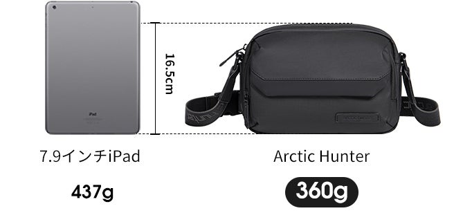 Arctic hunterは見た目が小さく見えるが、実は大容量です。24.5*16.5㎝のサイズで、7.9インチのiPadまで入ります。鍵や携帯電話、タブレットなどの必需品を収納できる十分なスペースがあります!