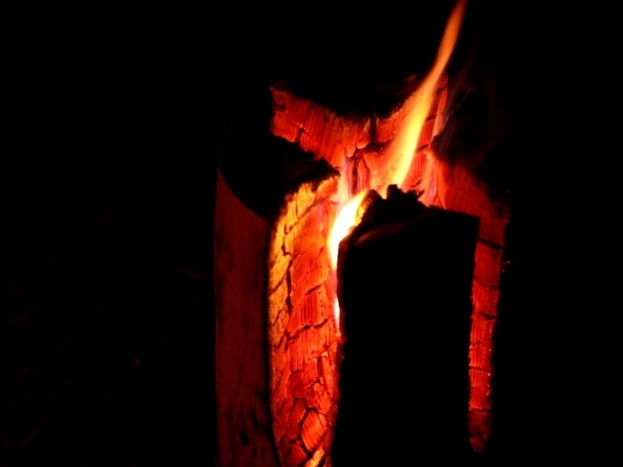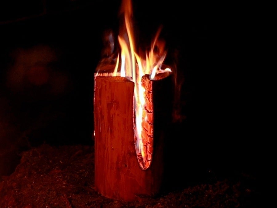 垂直に立てた木の幹に切り込み(十字)を入れて燃やす単純な構造で、熱と光を得る手法です。(ウィキペディア参照)